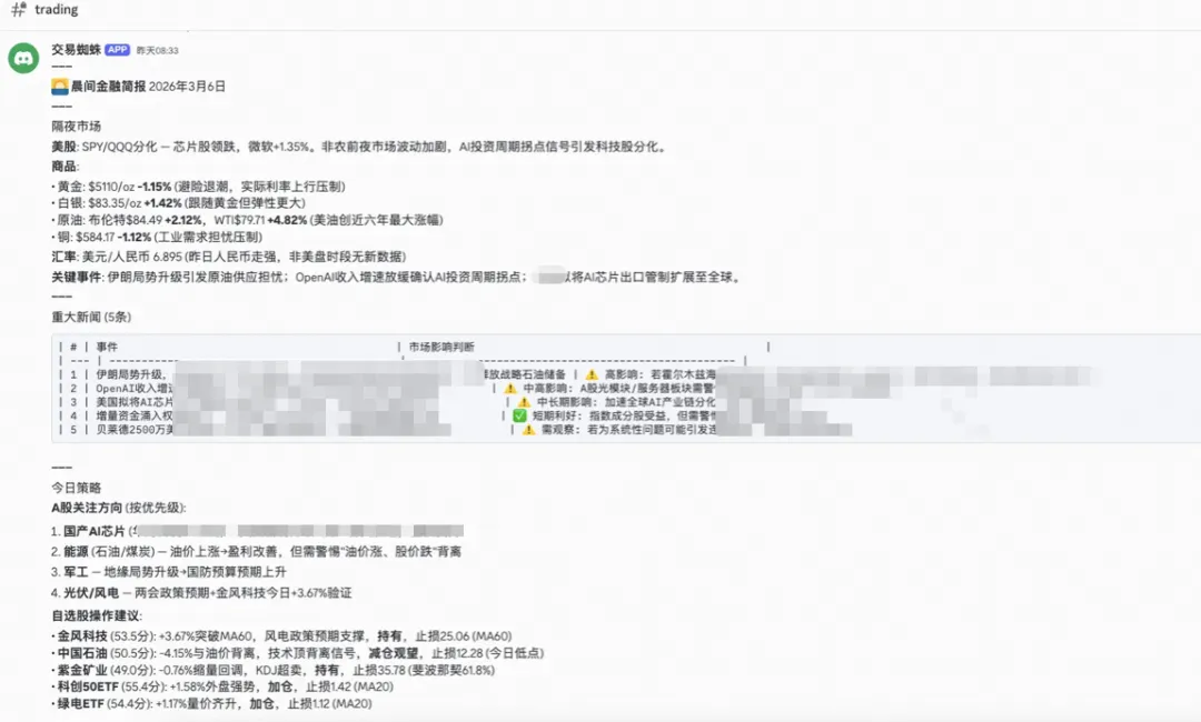 你睡着的时候,交易蜘蛛已经出了股市收盘报告。你醒来之前,宏观分析师已经写完了 A 股晨报。你还没刷手机,管家蜘蛛已经推来了天气、日程和今日待办。与此同时,AI 哨兵已经扫完了 GitHub Trending、arXiv 最新论文和 100+ 个信息源——18+ 条技术情报按重要性排好序等你看。内容蜘蛛已经在跟踪 54 个平台的热榜和 X 热点。