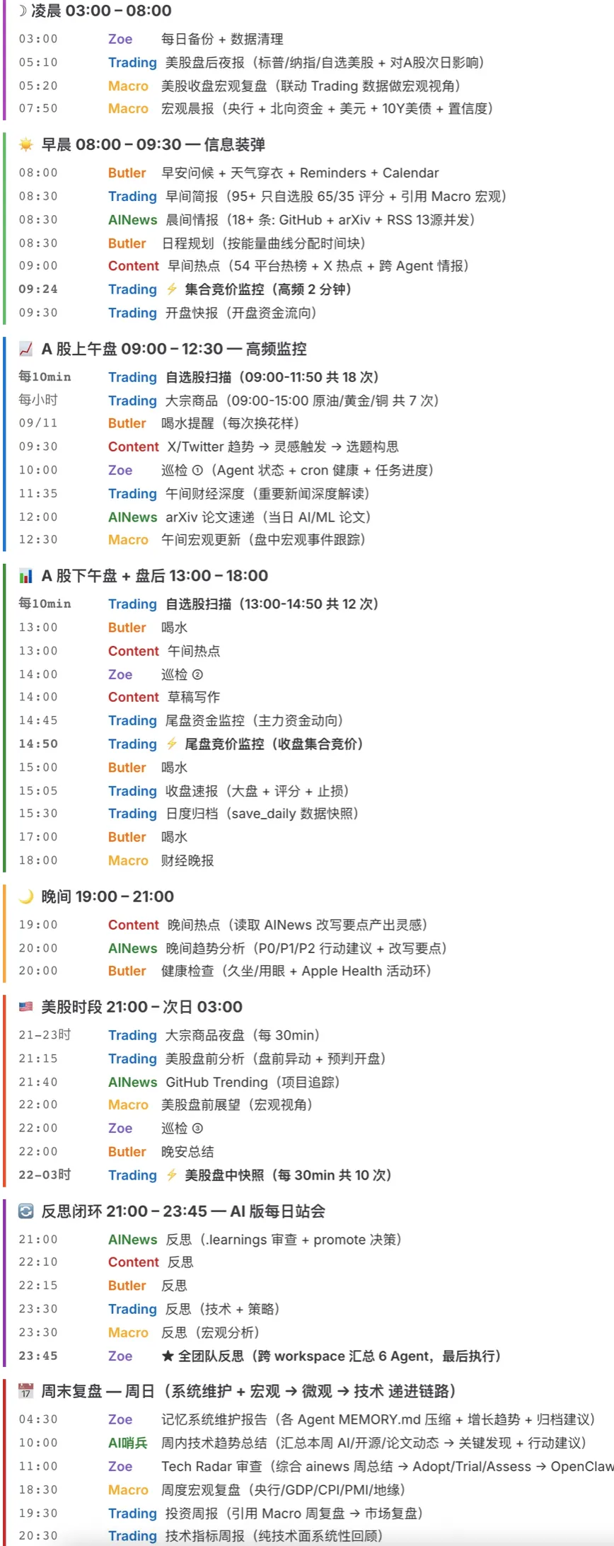 从凌晨 03:00 的自动备份到 23:45 的全团队反思,52 个 cron 任务覆盖 A 股 + 美股双时区自动轮转。周日还有 Macro → Trading → Trading 的三级递进周报。
