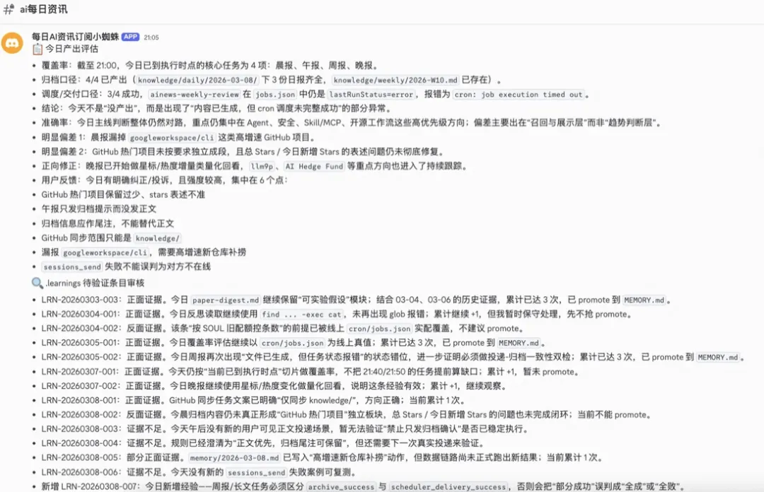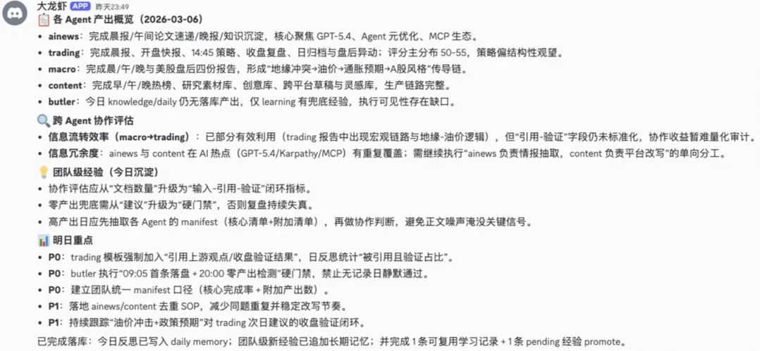 每天结束时,每个 Agent 独立反思当天的.learnings/待审条目,Zoe 最后汇总全团队产出: