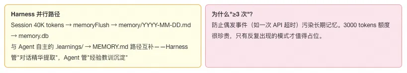 四个机制的执行顺序很重要——compaction 先于 contextPruning,确保有价值的内容先被提取到memory/,再被清理。self-improving-agent 的 bootstrap hook 在新 session 启动时触发,把.learnings/和MEMORY.md注入上下文——这是 Agent"记住上次学到的东西"的关键机制。