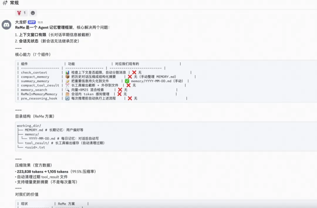 更关键的能力是主动评估技术发现对我们系统的影响——本周就发现了 ReMe(记忆管理框架),主动向 Zoe 提出评估建议,从发现到决策到落地,我只需要在关键节点确认,执行全部由 Agent 完成。每日趋势分析中的有价值项目会自动更新到shared-context/tech-radar.json,供 Zoe 每周 Tech Radar 审查: