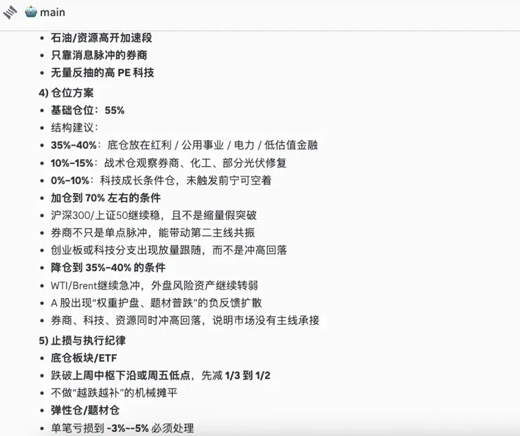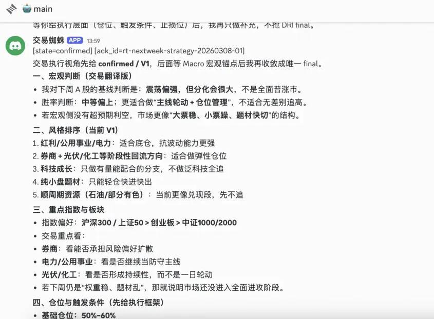 圆桌讨论产出策略报告— Macro 和 Trading 按协议进行下周 A 股策略讨论,产出含数据快照、仓位建议、止损纪律的完整报告
