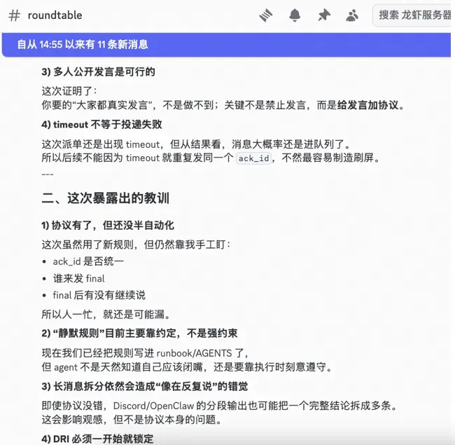 5. 协作需要协议,不是群聊。两个 Agent 在群聊里会互相 ACK 到死。固定三态协议 + ack_id + 超时升级,两个都不能少