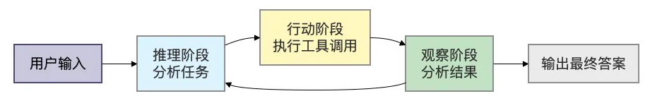 Agent先推理当前情况,决定下一步做什么,然后执行行动,观察结果,再继续推理,形成一个闭环。