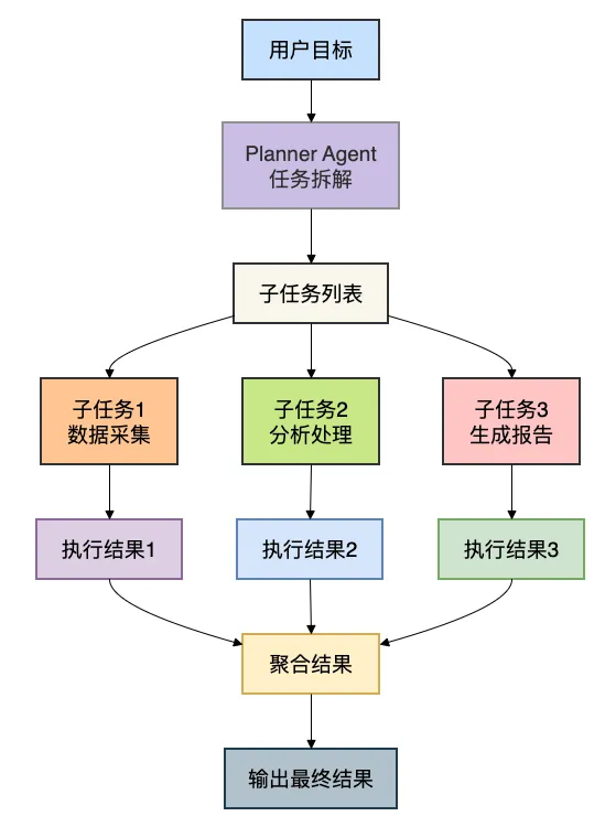 规划模式是应对复杂任务的核心武器。Plan Agent先将大任务拆解成多个子任务,再按顺序或并行执行。