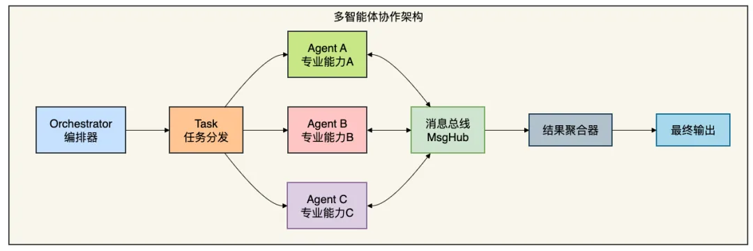 // 创建专业AgentReactAgent orderAgent = ReactAgent.builder() .name("订单Agent") .model(chatModel) .tools(queryOrderTool) .build();ReactAgent paymentAgent = ReactAgent.builder() .name("支付Agent") .model(chatModel) .tools(queryPaymentTool) .build();ReactAgent refundAgent = ReactAgent.builder() .name("退款Agent") .model(chatModel) .tools(processRefundTool) .build();// 构建协作中枢MsgHub hub = new MsgHub();// Agent订阅感兴趣的消息hub.subscribe("order:query", orderAgent);hub.subscribe("payment:status", paymentAgent);hub.subscribe("refund:process", refundAgent);// 发布消息,触发协作hub.publish(new Message("order:query", "查询订单ORD-123的详细信息"));// Agent可以相互通信完成任务orderAgent.onMessage("order.found", (msg) -> { hub.publish(new Message("payment:status", "检查订单" + msg.getData() + "的支付状态"));});多智能体通信机制: