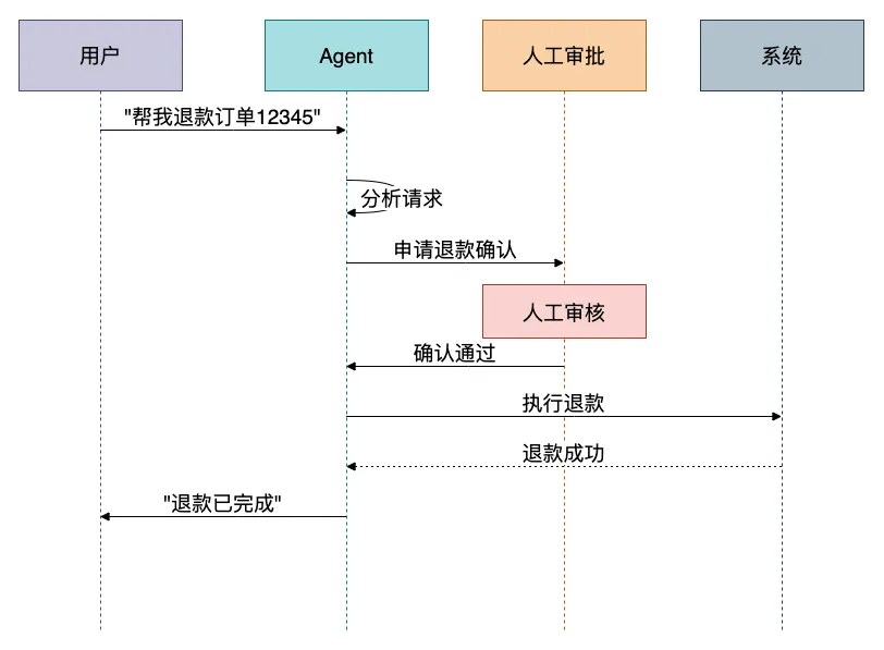 publicclassHumanInTheLoopAgent{privatefinal ReactAgent agent;privatefinal ApprovalService approvalService;public String processWithApproval(UserRequest request){// 1. Agent分析意图 String analysis = agent.call("分析以下请求的意图和所需操作:" + request.getText() );// 2. 判断是否需要人工审批if (requiresApproval(analysis)) {// 3. 发送审批请求 ApprovalRequest approval = ApprovalRequest.builder() .userId(request.getUserId()) .operation(extractOperation(analysis)) .details(analysis) .build(); ApprovalResult result = approvalService.requestApproval(approval);if (!result.isApproved()) {return"操作被拒绝,请联系管理员"; } }// 4. 执行操作return agent.call("执行以下操作:" + analysis); }privatebooleanrequiresApproval(String analysis){// 检测敏感关键词:退款、删除、修改权限、批量操作等 String[] sensitiveKeywords = {"退款", "删除", "修改权限", "批量"};for (String keyword : sensitiveKeywords) {if (analysis.contains(keyword)) {returntrue; } }returnfalse; }}优点:提升系统安全性,防止AI误操作;满足金融、政务等行业的合规要求;增强用户对AI的信任感。