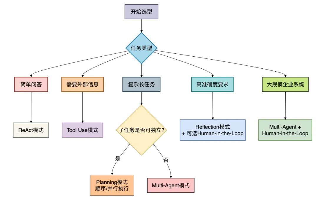 从最简单的单体Agent到复杂的多智能体协作,每种模式都有其独特的优势和适用场景。