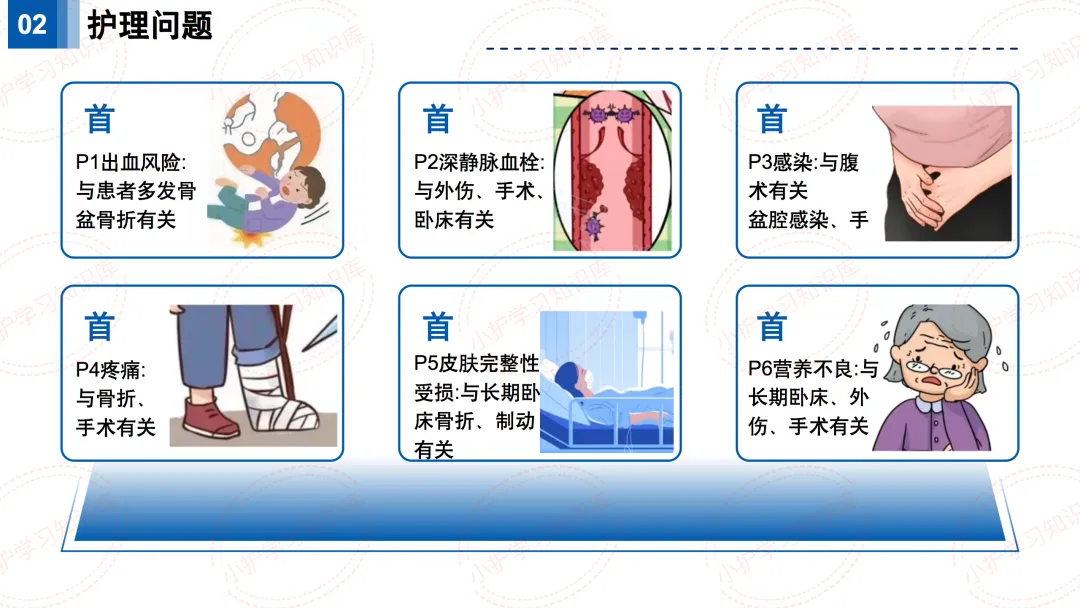 资料中总结了六大问题:出血风险、深静脉血栓、感染、疼痛、皮肤完整性受损以及营养不良。