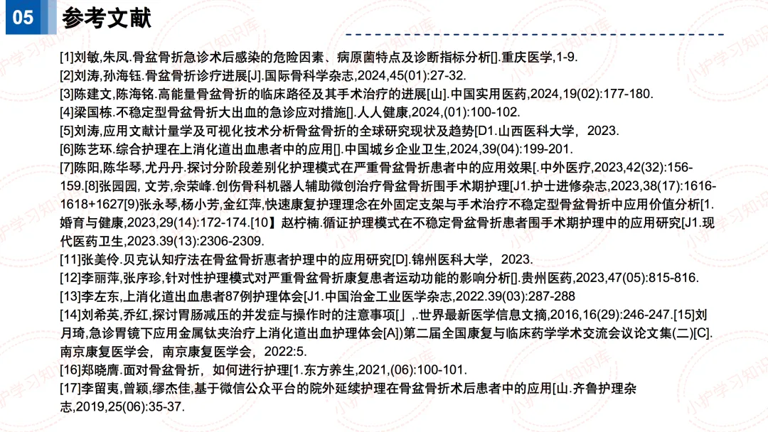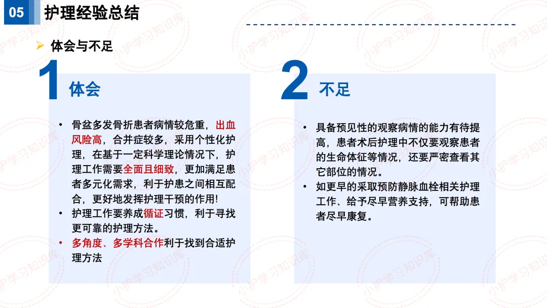 通过这个案例,我们体会到,对于骨盆多发骨折这类危重患者,护理工作需要全面且细致,要养成循证的习惯,并加强多学科合作。
