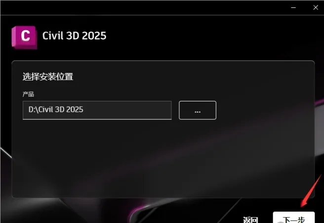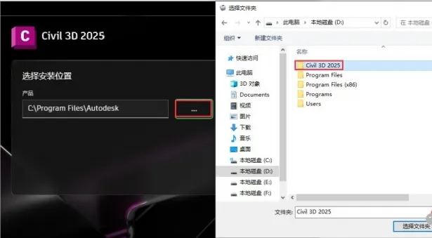 5.点击【…】选择软件安装位置(建议不要安装在C盘,可在D盘或其它磁盘下新建一个“Civil 3D 2025”文件夹)。