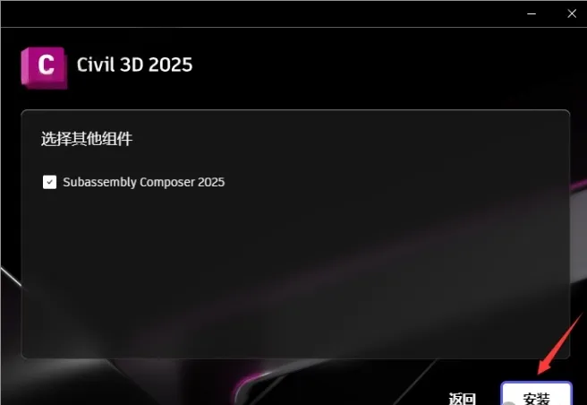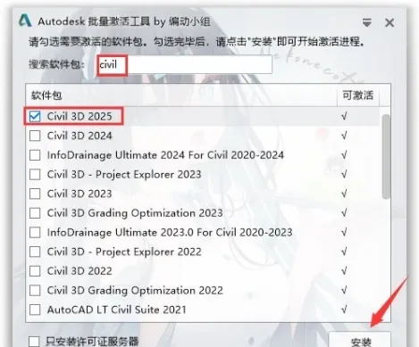 12.输入“civil”按回车键,勾选【Civil 3D 2025】点击安装。