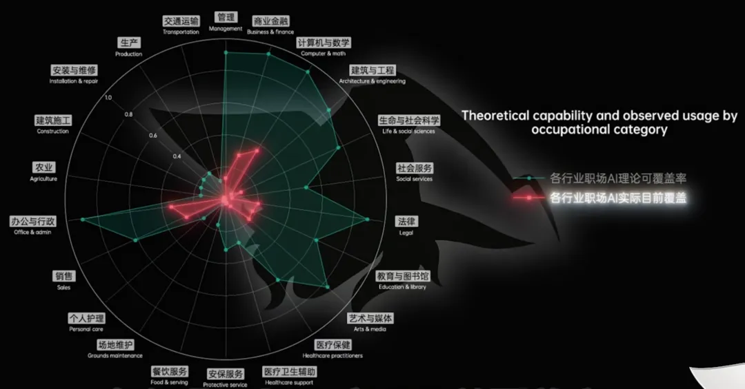 前段时间看到一张图,绿色是AI理论上能覆盖的岗位范围,红色是AI目前实际覆盖的部分。红色大概只有绿色的十分之一。这说明今天网上很多"AI将取代大量岗位"的说法,讲的是理论能力,不是现实里已经发生的事。理论上能做和现实里能用,从来不是一回事。从"模型能力很强"到"岗位真的被重塑",中间要经过产品化、系统集成、数据对接、合规审查、责任划分、员工培训、组织适配,每多一层,落地概率就往下掉一截。真正难的往往不是AI会不会,而是企业敢不敢把关键流程真的交给它。这里面不只是技术问题,还有责任问题、组织问题、信任问题。所以很多AI替代论最大的问题不是夸张,而是偷换了一个概念:把"任务可替代"说成了"岗位会消失"。AI能帮你写初稿、整理纪要、处理部分重复性信息,但拍板、背责任、处理复杂人际关系、在灰度地带做判断,这些事它目前还替不了。真实工作从来不是纯信息处理,而是信息处理、沟通、判断、协调、担责混在一起,AI能cover的只是其中一个切片。