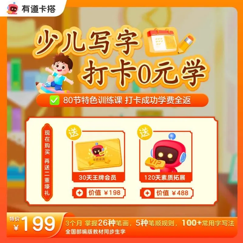 【是否限购】此前购买过少儿写字打卡0元学/128元写字课/49元写字课/有道编程0元学的家长不能再次购买;该活动仅限手机账号参与,登录App时,请选择手机号+验证码登录,不要使用其他登录方式!