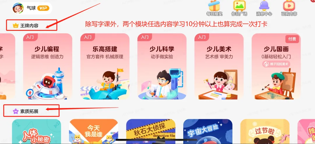 ● 在有道卡搭APP内任意视频内容板块学习10分钟或以上(【王牌内容】【素质拓展】【写字打卡专用】专用三个板块)