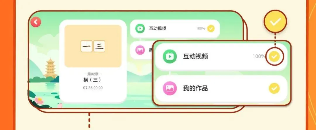 2、每个章节封面点击进入后即可看到【互动视频】和【我的作品】,【互动视频】完成进度可看到页面具体数字百分比展示,【我的作品】如成功提交练字作品,则会 ✔,如下图所示:
