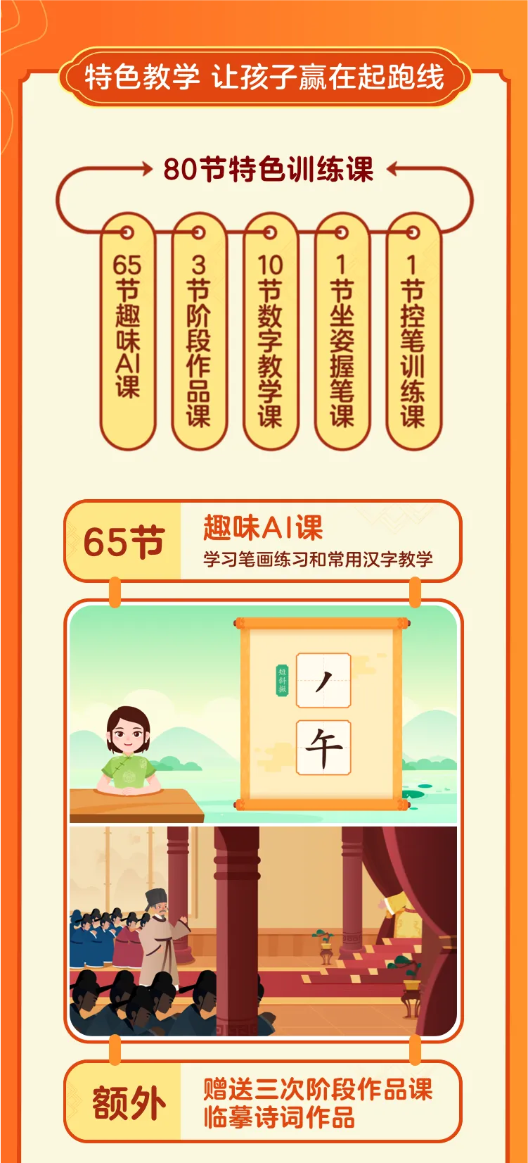 写字课:65节AI写字课+3节阶段作品课+2节坐姿课+10节数字练习课