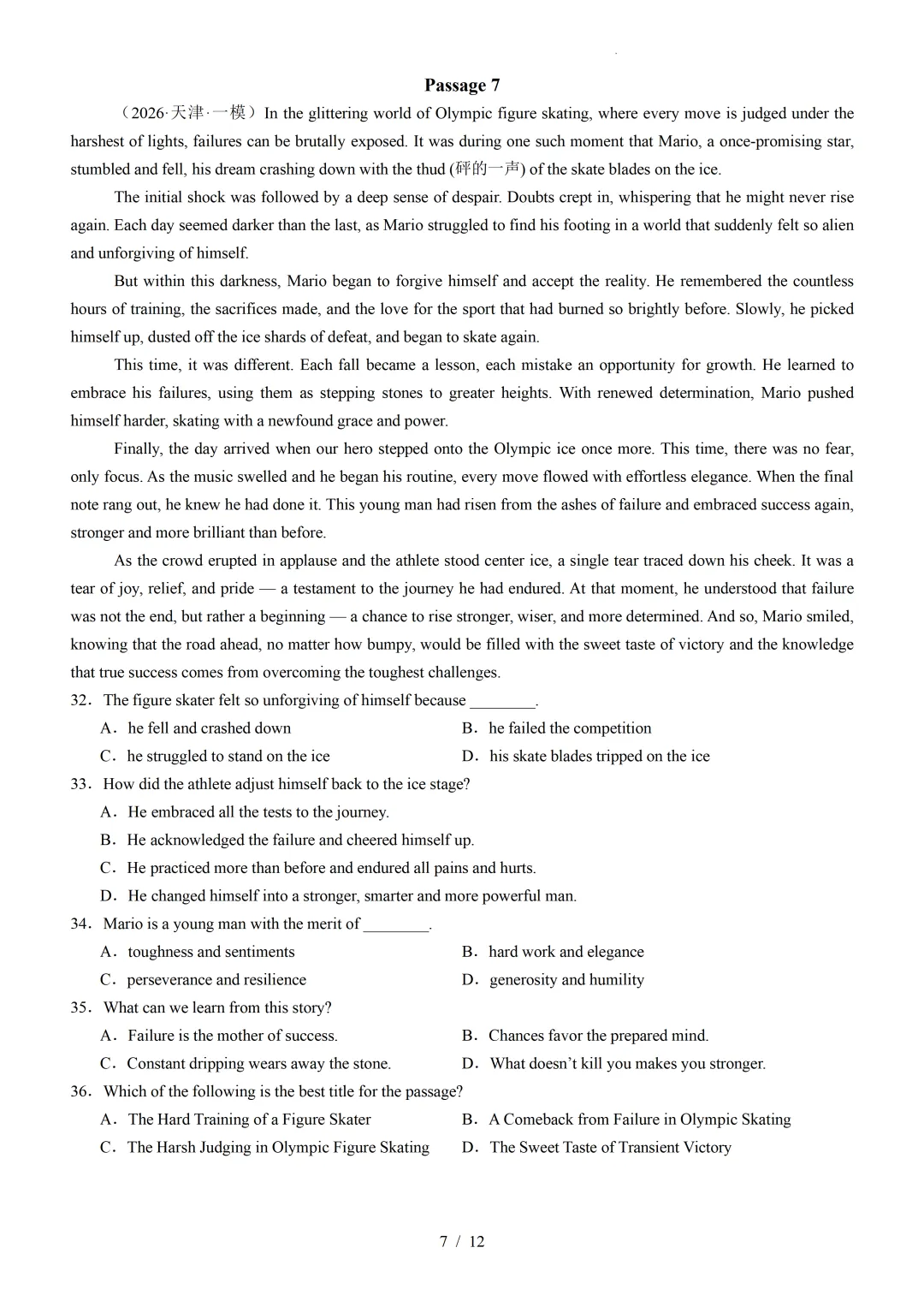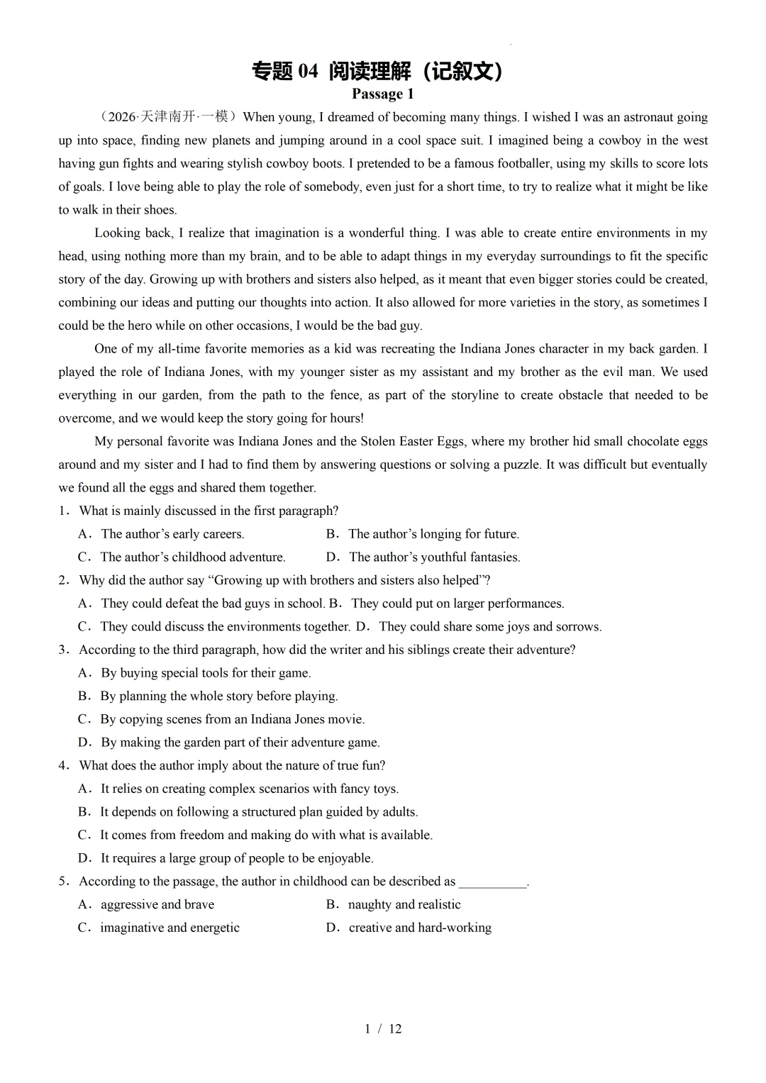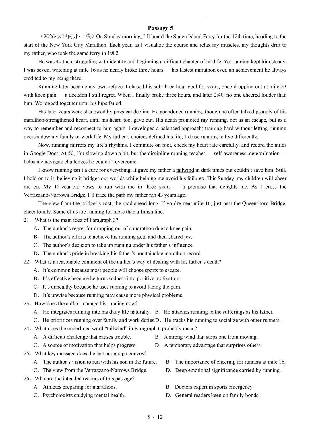 【可下载】2026年高考英语一模分类汇编04+阅读理解记叙文(天津专用)(附解析和答案)点击上方“蓝字”免费关注!本套试卷+答案解析下载入口关注“卿卿侃古今”公众号点击左下角阅读原文可下载相关链接:2007-2025年天津市高考英语真题汇总(持续更新中~)2011-2023年天津高考英语听力真题在线测试【高考英语听力在线测试】高考听力机考模拟试题大全(持续更新中)【可下载】2025-2026年高中英语试题汇总(附解析)【持续更新中】【汇总】高中英语月考和期中期末试题(持续更新中~)【题库】高一英语试题汇编(持续更新中~)【题库】高二英语试题汇编(持续更新中~)【题库】高三英语试题汇编(持续更新中~)【可下载】高三英语上学期期末试题16套(附解析)【可下载】高二英语上学期期末试题10套(附解析)【可下载】高一英语上学期期末试题汇9套(附解析)【可下载】2025-2026学年度高一高二高三开学考试模拟试卷(天津专用)(附解析)新外研版高中英语高清电子课本、课文原文和译文、单元同步复习资料和试题【持续更新中】【目录1】高中英语阅读理解限时训练大全(持续更新中~)【目录2】高中英语完形填空限时训练大全(持续更新中~)【目录3】高中英语书面表达大全(持续更新中~)【目录4】高中英语听力训练大全(持续更新中~)【目录5】高中英语单选题大全(持续更新中~)【目录6】高中英语语法题大全(持续更新中~)【目录7】高中英语阅读表达题大全(持续更新中~)【目录8】科普知识汇总【目录9】中高考学法知识汇总【目录10】高考英语真题+名校模拟真题+月考和期中期末试题(持续更新中~)【目录11】暑期高考英语备考资料大全持续更新中~【汇总】中高考志愿填报资料大全【汇总】高中英语月考和期中期末试题(持续更新中~)【汇总】2025届高三英语一模试题(附解析)【汇总】2024届高三英语一模二模三模试题(附解析)【汇总】2024届高考英语押题卷(附解析)【汇总】2025届高三英语周考综合练(附解析)【题库】高三英语限时训练(持续更新中~)【模拟】2025届高三英语听力机考模拟试题在线测试【高考词汇】(新)外研版高中英语全七册词汇表(附音频)【中考词汇】初中英语外研版必备单词表(完整版),可打印 建议收藏保存点击阅读原文查更多