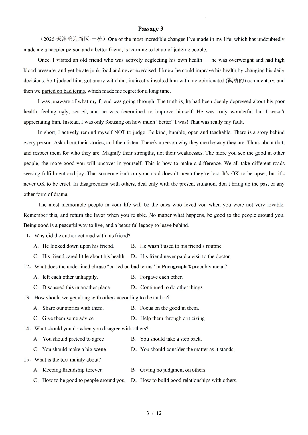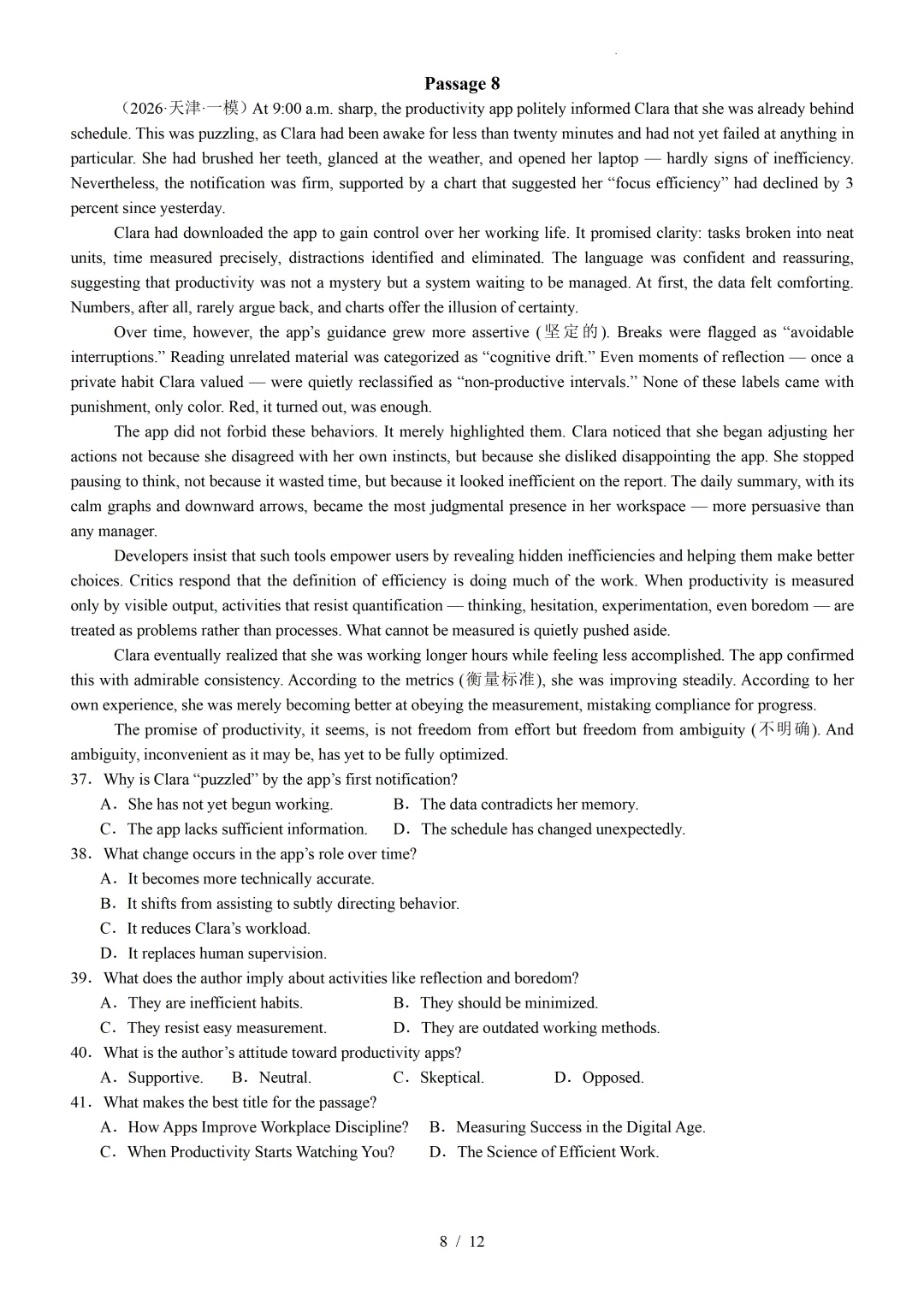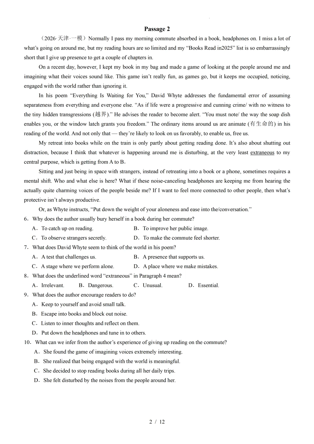 【可下载】2026年高考英语一模分类汇编04+阅读理解记叙文(天津专用)(附解析和答案)点击上方“蓝字”免费关注!本套试卷+答案解析下载入口关注“卿卿侃古今”公众号点击左下角阅读原文可下载相关链接:2007-2025年天津市高考英语真题汇总(持续更新中~)2011-2023年天津高考英语听力真题在线测试【高考英语听力在线测试】高考听力机考模拟试题大全(持续更新中)【可下载】2025-2026年高中英语试题汇总(附解析)【持续更新中】【汇总】高中英语月考和期中期末试题(持续更新中~)【题库】高一英语试题汇编(持续更新中~)【题库】高二英语试题汇编(持续更新中~)【题库】高三英语试题汇编(持续更新中~)【可下载】高三英语上学期期末试题16套(附解析)【可下载】高二英语上学期期末试题10套(附解析)【可下载】高一英语上学期期末试题汇9套(附解析)【可下载】2025-2026学年度高一高二高三开学考试模拟试卷(天津专用)(附解析)新外研版高中英语高清电子课本、课文原文和译文、单元同步复习资料和试题【持续更新中】【目录1】高中英语阅读理解限时训练大全(持续更新中~)【目录2】高中英语完形填空限时训练大全(持续更新中~)【目录3】高中英语书面表达大全(持续更新中~)【目录4】高中英语听力训练大全(持续更新中~)【目录5】高中英语单选题大全(持续更新中~)【目录6】高中英语语法题大全(持续更新中~)【目录7】高中英语阅读表达题大全(持续更新中~)【目录8】科普知识汇总【目录9】中高考学法知识汇总【目录10】高考英语真题+名校模拟真题+月考和期中期末试题(持续更新中~)【目录11】暑期高考英语备考资料大全持续更新中~【汇总】中高考志愿填报资料大全【汇总】高中英语月考和期中期末试题(持续更新中~)【汇总】2025届高三英语一模试题(附解析)【汇总】2024届高三英语一模二模三模试题(附解析)【汇总】2024届高考英语押题卷(附解析)【汇总】2025届高三英语周考综合练(附解析)【题库】高三英语限时训练(持续更新中~)【模拟】2025届高三英语听力机考模拟试题在线测试【高考词汇】(新)外研版高中英语全七册词汇表(附音频)【中考词汇】初中英语外研版必备单词表(完整版),可打印 建议收藏保存点击阅读原文查更多