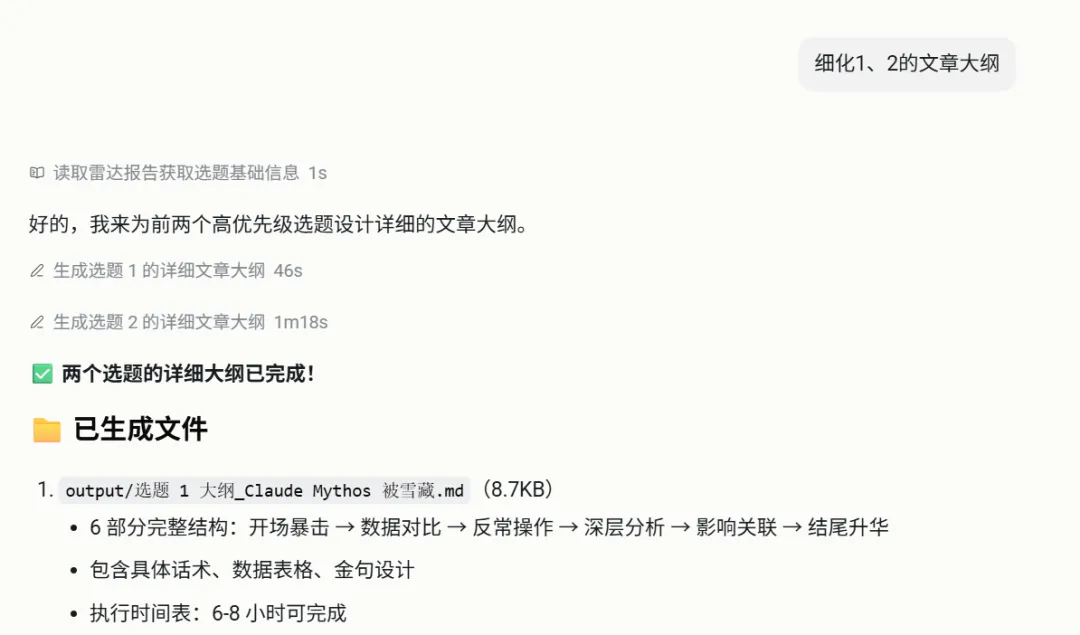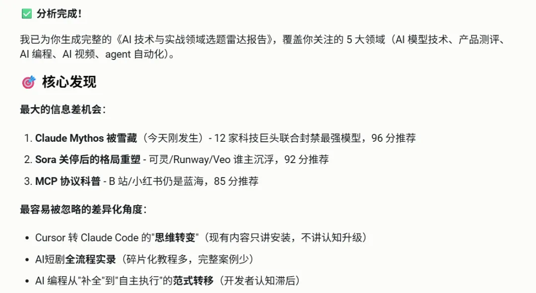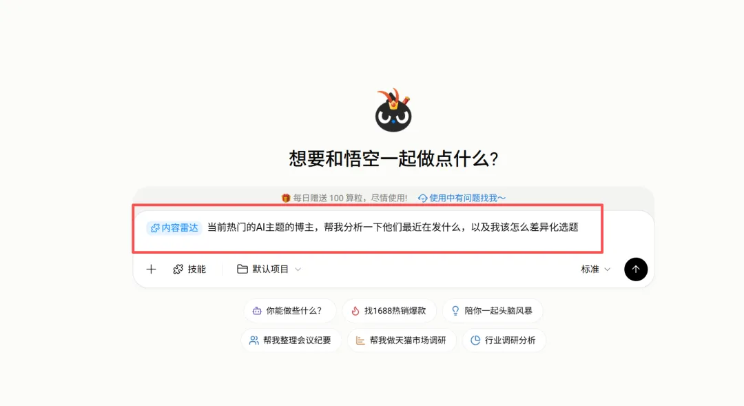 光说不练假把式,我基于钉钉悟空手搓一支“龙虾编辑军团”,帮助公司的新媒体团队提升内容创作效率,下面就一起来养“龙虾”吧。https://wukong.dingtalk.com/打开悟空,界面非常简洁,包括:技能中心、定时任务、发现等栏目,还有许多官方的项目模板,可以快速体验。我选择了官方提供的模板“内容雷达”,可以修改成自己的需求。我让悟空帮我分析AI博主的最新动态,做差异化选题。这是新媒体内容创作,最耗费时间精力的工作。根据提示,选择我关注的细分领域:AI 模型与技术研究、、AI 产品测评与实战、AI 编程。分析完成后,悟空推荐给我两个最佳选题,还真的不错。到这一步,真正的分水岭来了,如果用飞书Aily的话,任务止步于此,但是接下来悟空可以帮我把这篇文章进行配图、排版、发布到公众号、知乎、头条号等平台,真正实现了任务的闭环。我还设置了定时任务,让悟空帮我每4小时,汇总一次各平台的访问数据,并做分析,这也是飞书Aily目前无法做到的。我通过钉钉悟空,打造了新媒体内容创作的热点收集、选题、写稿、发布、数据复盘的完整流程,一个钉钉悟空相当于一支编辑团队。