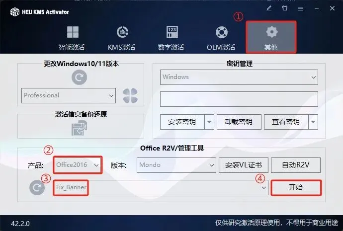 6.修复许可证弹窗:点击其他】,产品选择【Office2016】再选择【Fix_Banner】最后点击【开始】。