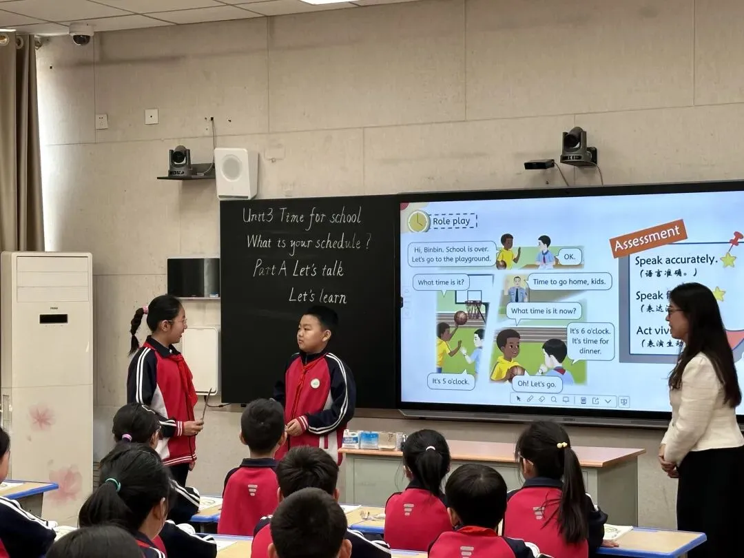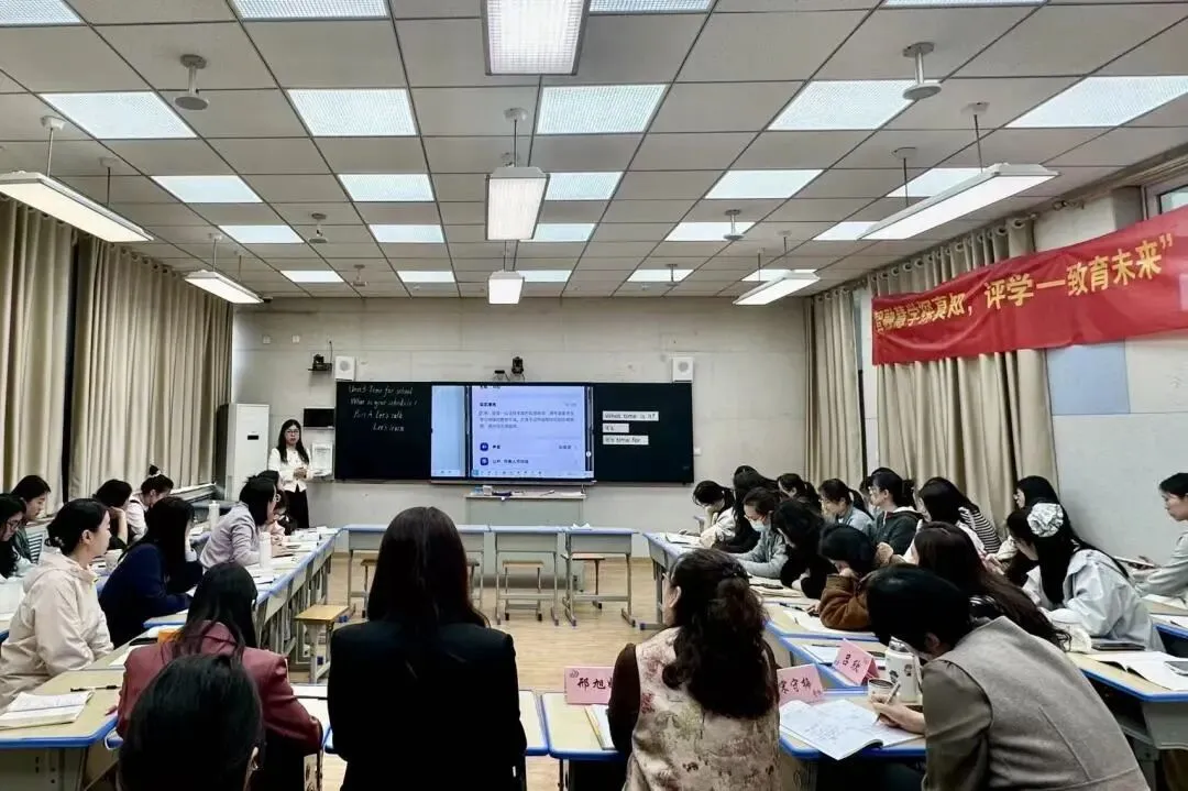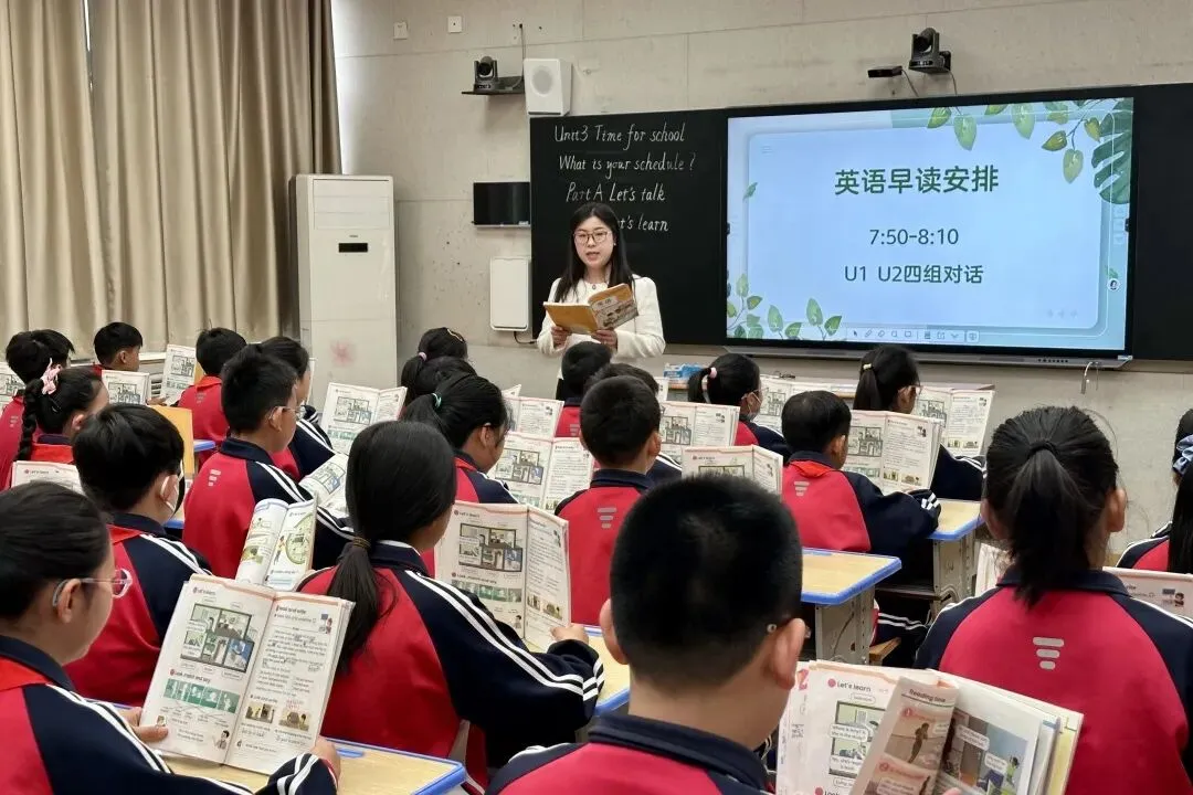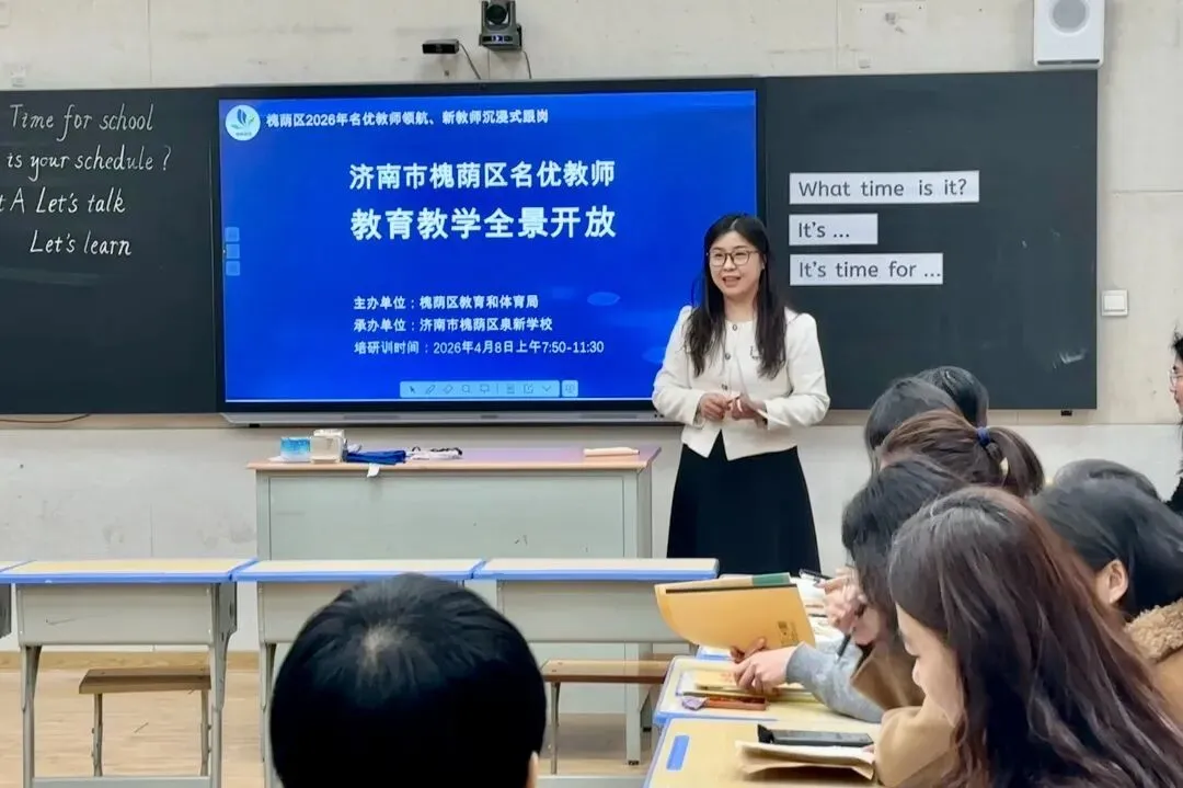 春光作伴,研学正浓。4月8日上午,槐荫区名优教师小学英语“家常”教学全景开放研训活动在泉新学校如期举行。继续教育室张馨主任、吕欣老师、宋嘉惠老师,电教站负责人宋守梅,小学英语教研员邢旭娜及泉新学校党总支副书记张璇参会指导。本次活动全程聚焦区名优教师、济南市教学能手潘琪老师的教学日常——从晨读、课前准备到一节完整课堂的呈现,展示了人工智能时代下常态英语教学的一种可行路径。全区近两年入职的新教师、泉新教育集团校教师代表及部分青年教师共同观摩、探讨AI赋能“家常课”的具体方法。