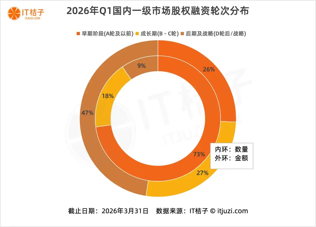 在资本调整周期里,那些能撑到后期的头部项目,依然享受着流动性溢价。IT桔子数据显示,2026年Q1,国内D轮及以后的融资事件数量,只占全部的9.6%,却拿走了47.6%的融资额——1218.5亿人民币。也就是说,将近一半的钱涌向了那不到一成的后期项目,与海外市场如出一辙。