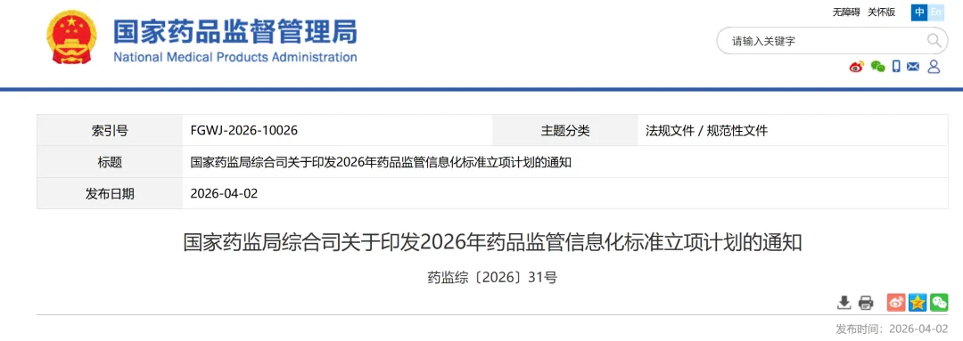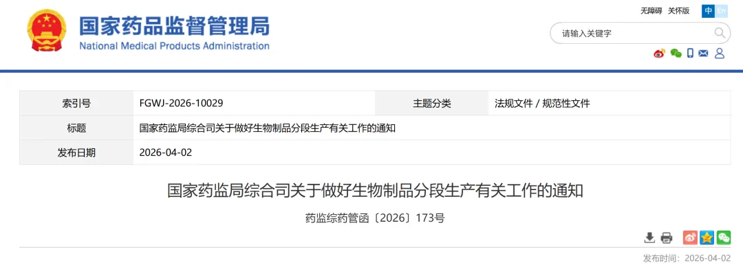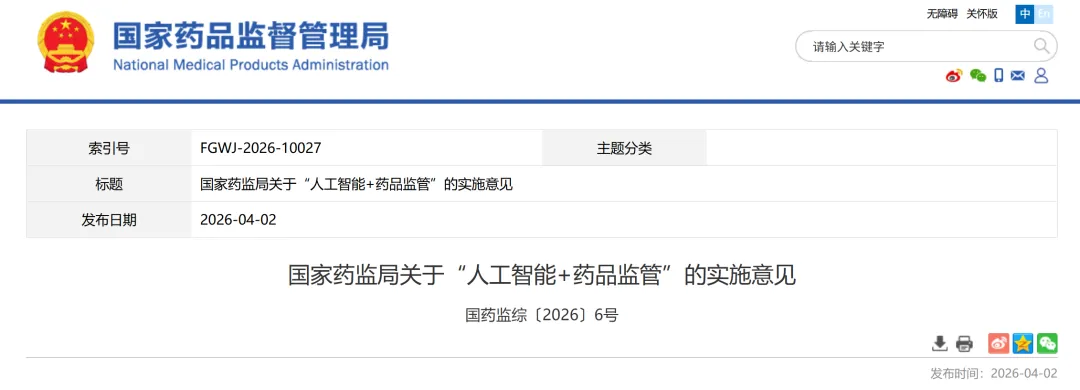 4月1日,国家药监局集中发布了《“人工智能+药品监管”的实施意见》、《2026年药品监管信息化标准立项计划》和《做好生物制品分段生产有关工作的通知》。