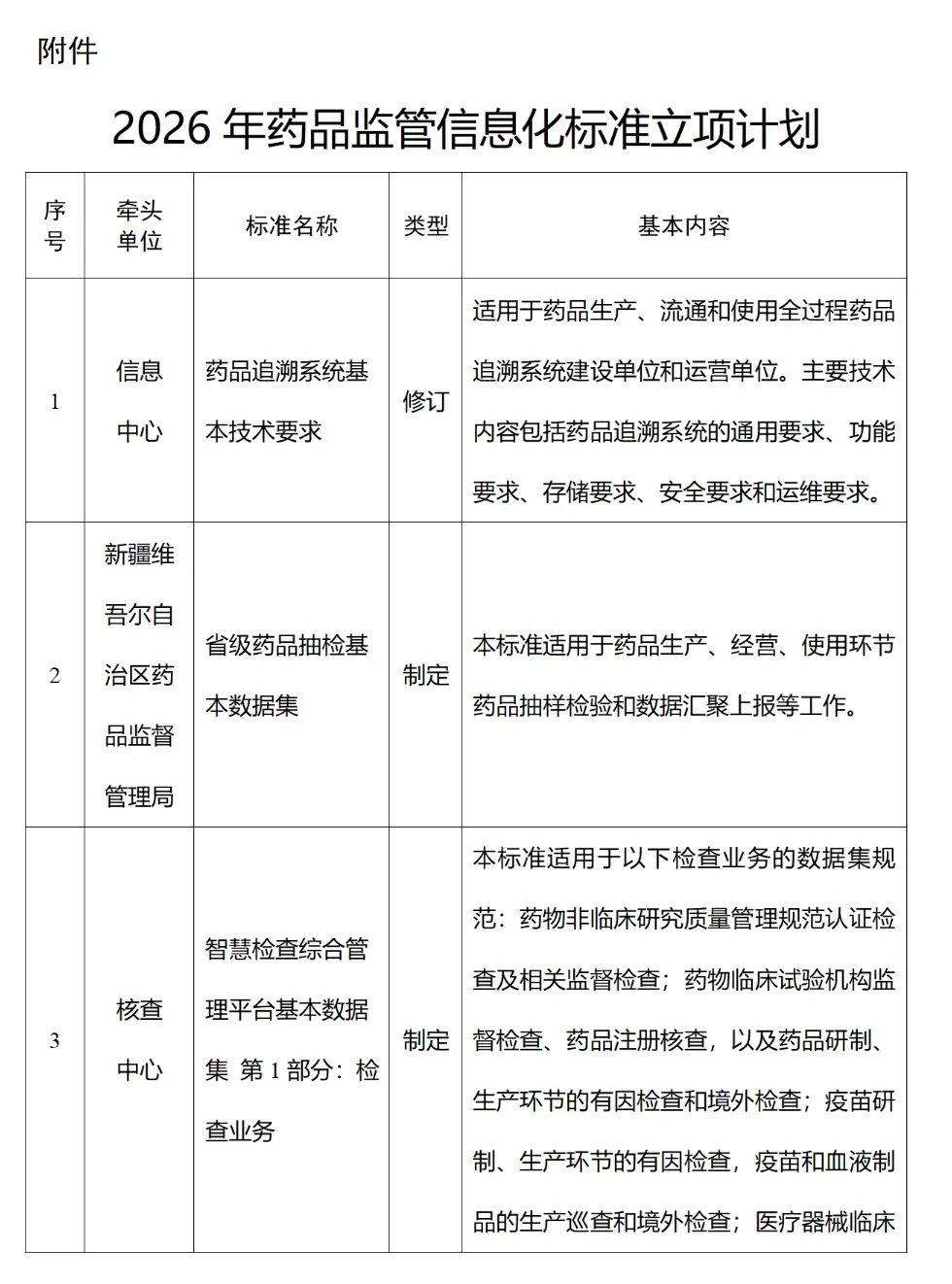《2026年药品监管信息化标准立项计划的通知》则对《药品追溯系统基本技术要求》等9项标准制修订项目立项。