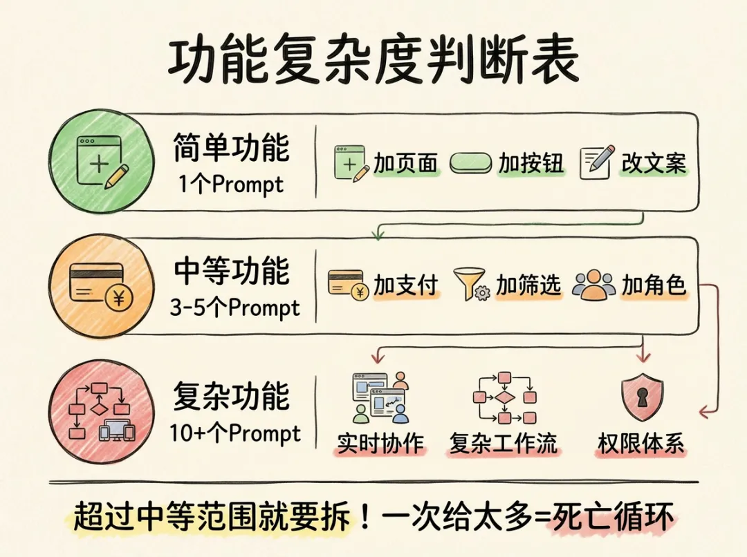 简单功能1个prompt搞定。中等功能3-5 个 prompt。复杂功能10 个以上。如果你一个 prompt 里描述的内容超过了"中等"范围,就需要拆。
