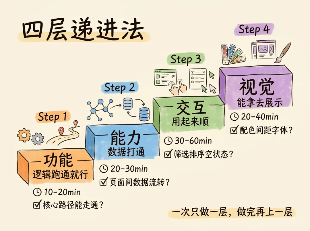 为什么这个顺序重要? 每一层都在上一层稳定的基础上叠加。如果第一层就同时做功能和视觉,AI 修功能 bug 会把视觉改乱,修视觉会破坏功能逻辑。一次只处理一层复杂度,AI 犯错概率大幅降低。