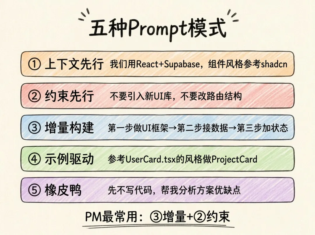 PM 日常最常用的组合是 ③增量构建 + ②约束先行——跟四层递进法天然匹配。