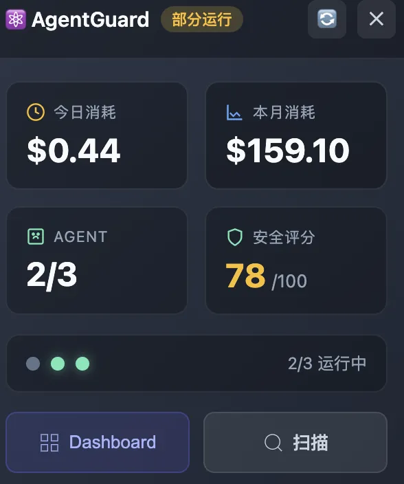 完整版:Web Dashboard + 桌面悬浮球 + 后端自动采集 + SQLite 数据库。实时监控 12 个 AI 工具的安全状态和成本,打开就能看到数据。