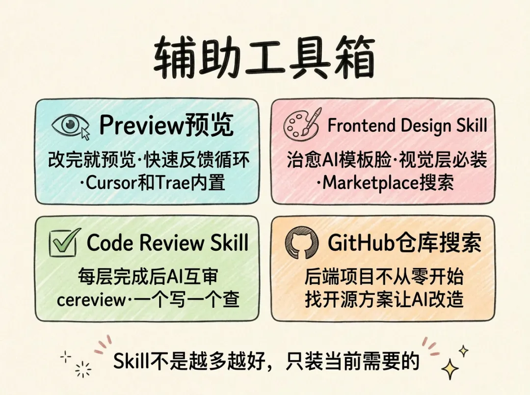 辅助工具箱(Preview / Design Skill / Code Review / GitHub 搜索)