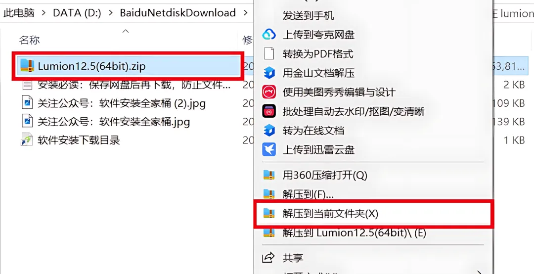 1.下载Lumion12.5软件安装包到电脑上,右键选择【解压到当前文件夹】。