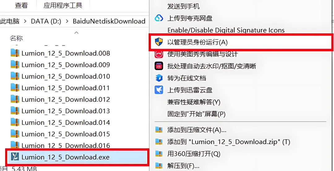 3.鼠标右击【Lumion_12 5……】选择【以管理员身份运行】。