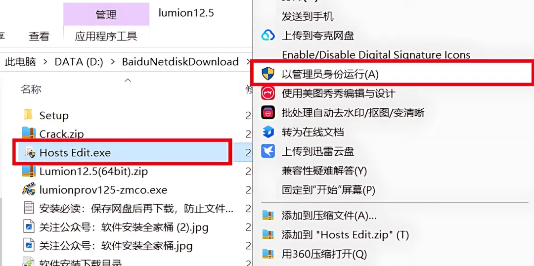 17.打开安装包解压后的【Lumion12.5(64bit)】文件夹,鼠标右击【Hosts Edit】选择【以管理员身份运行】。
