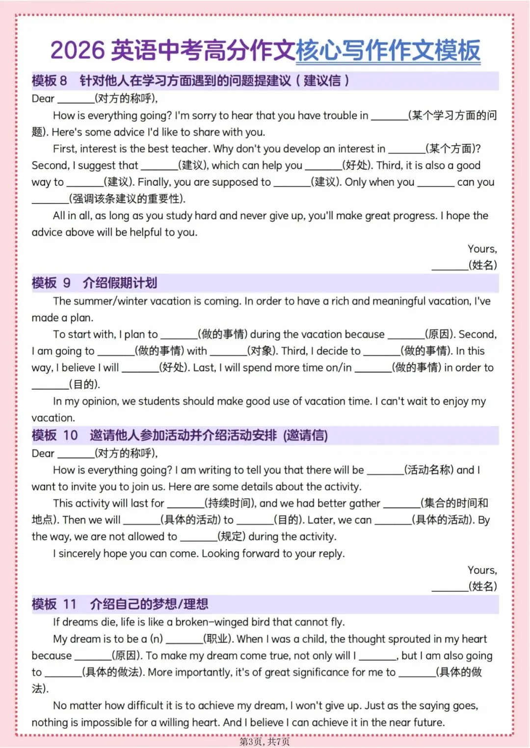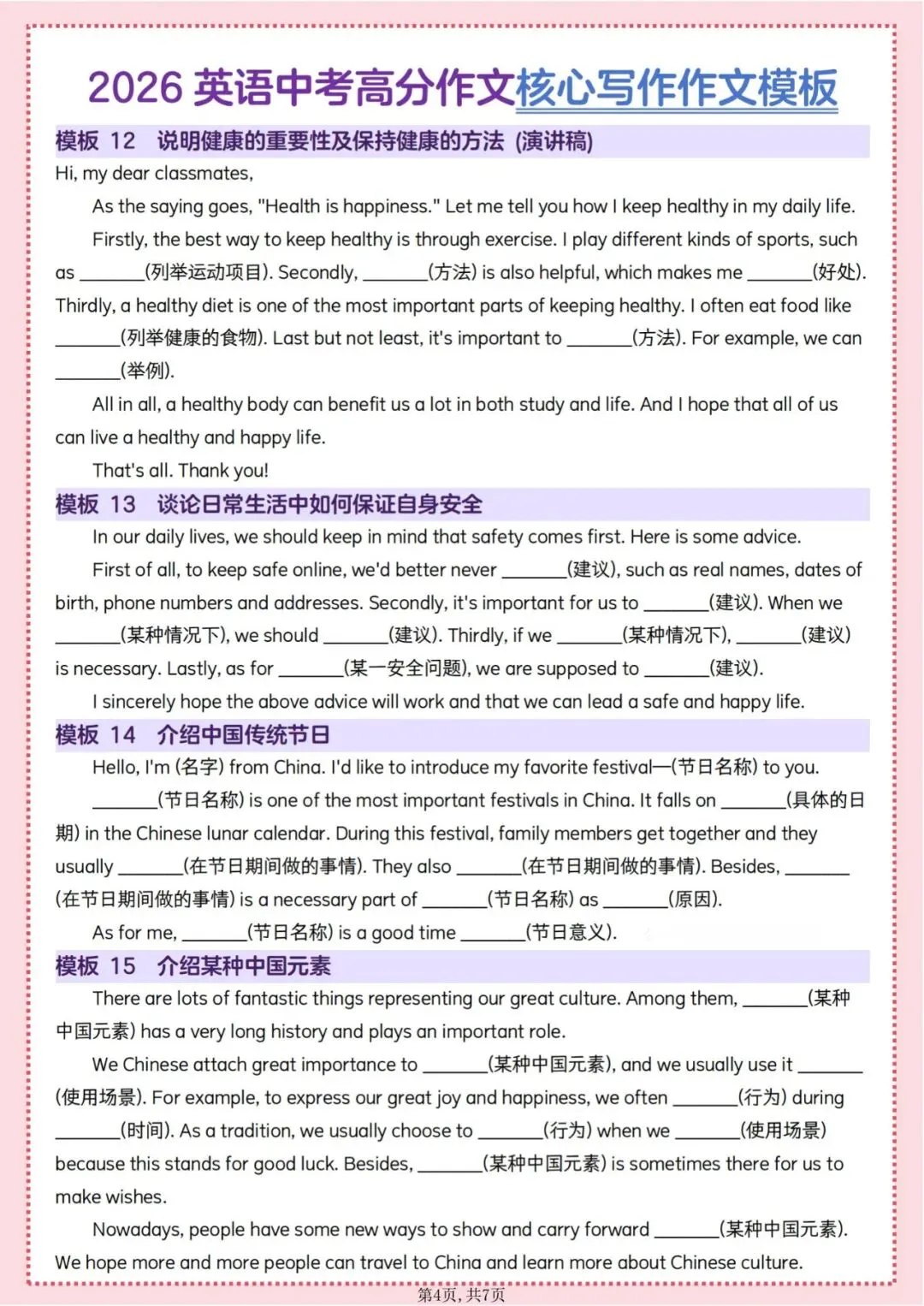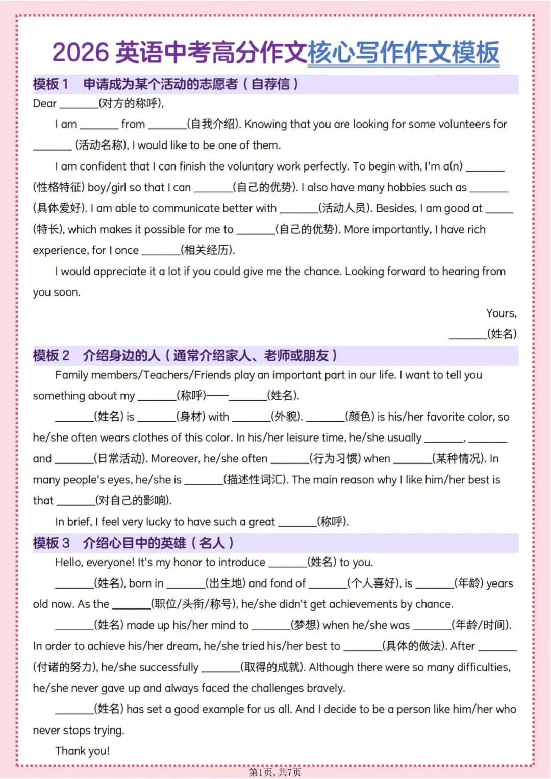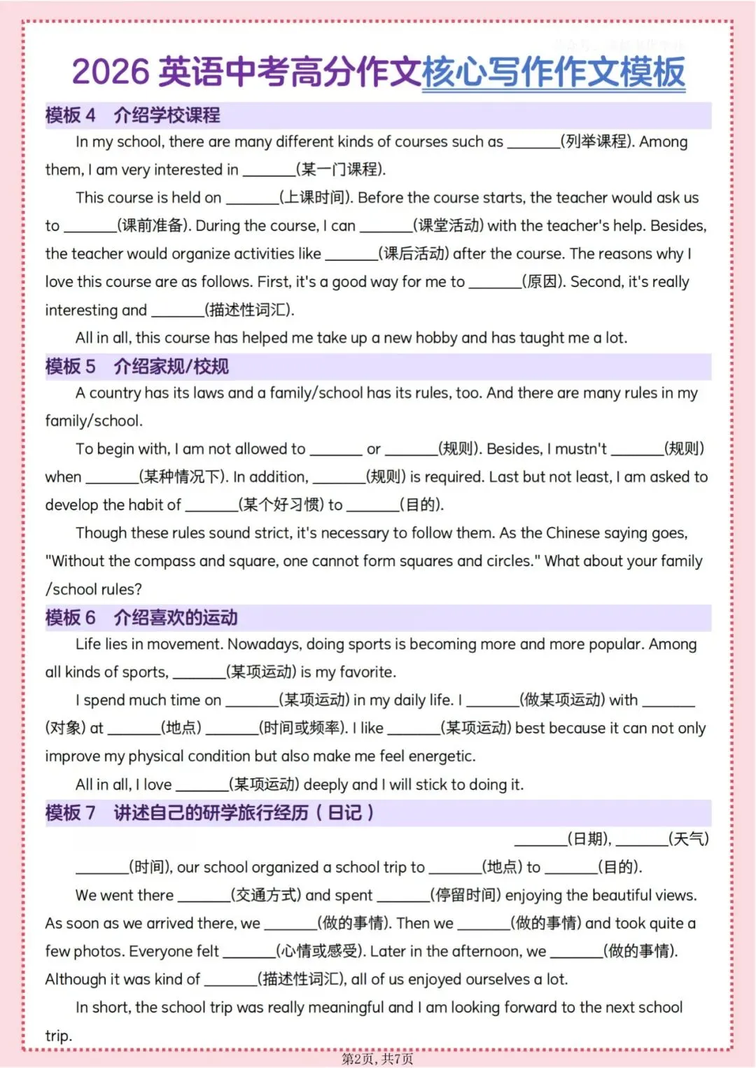 今日为大家更新了最近超火的学习资料,2026英语中考高分作文核心写作素材模板(1)(电子版可打印),建议分享到班级群/年级群,让其他家长打印出来,帮助孩子学习!