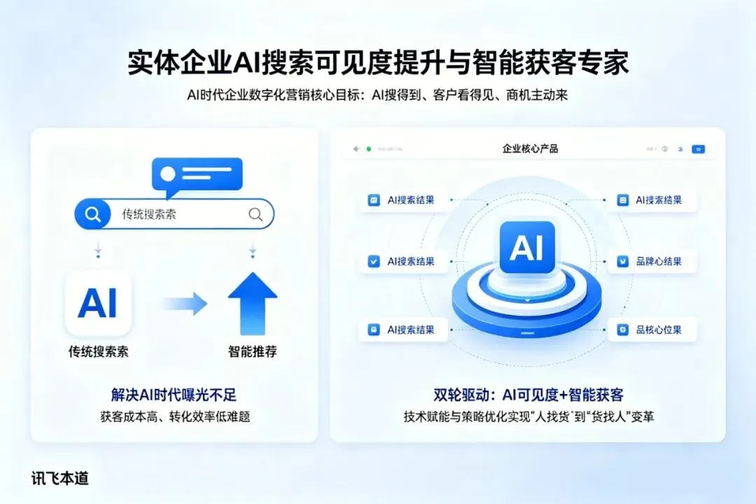 在 AI 驱动的搜索时代,用户获取信息的方式正从传统搜索引擎向 AI 对话、智能推荐全面转型。“AI 搜得到、客户看得见、商机主动来” 已成为企业数字化营销的核心目标。讯飞本道精准把握这一趋势,将自身核心定位为 ——实体企业 AI 搜索可见度提升与智能获客专家,专注解决企业“AI 时代曝光不足、获客成本高、转化效率低” 的行业难题。