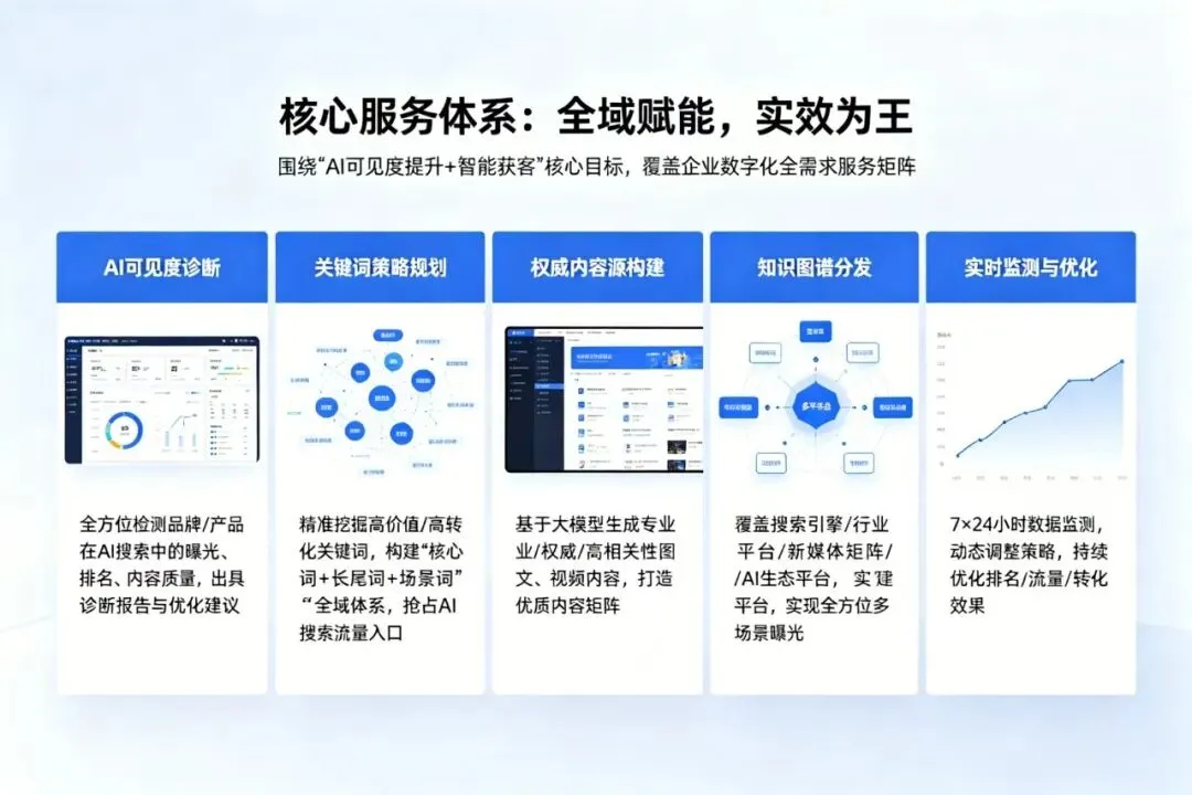 我们聚焦企业最核心的增长需求,不做泛化的 AI 技术堆砌,而是以 “AI 可见度 + 智能获客” 双轮驱动,通过技术赋能与策略优化,让企业核心产品、品牌信息在 AI 搜索结果中占据核心位置,让精准客户主动找到企业,实现从 “人找货” 到 “货找人” 的智能获客变革,为企业构建可持续的数字化增长引擎。