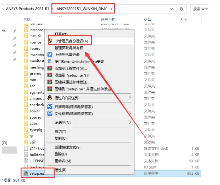 3. 右键点击 【setup.exe】,点击【以管理员身份运行】。