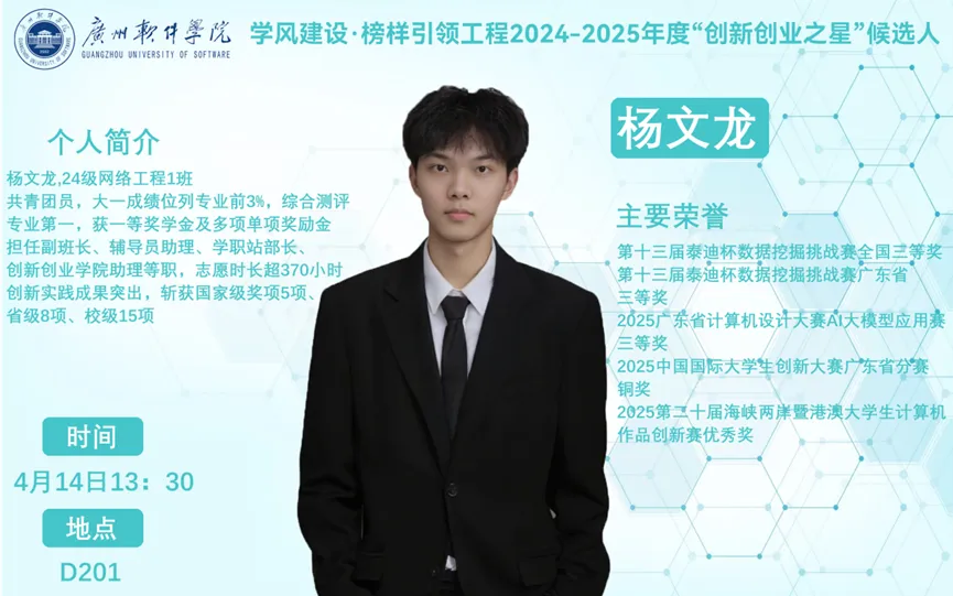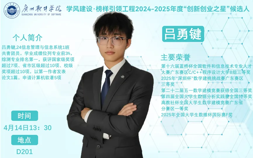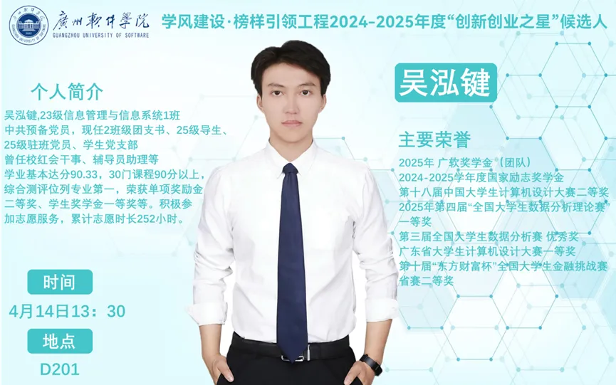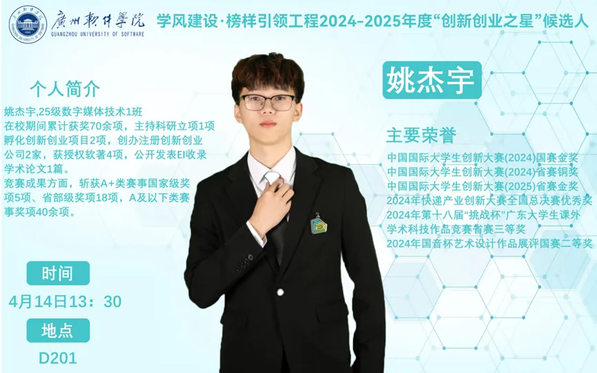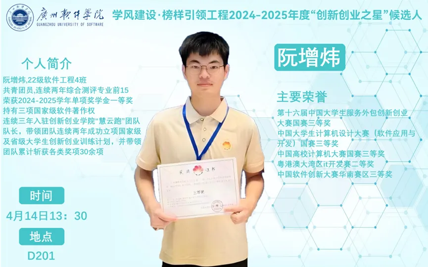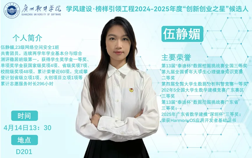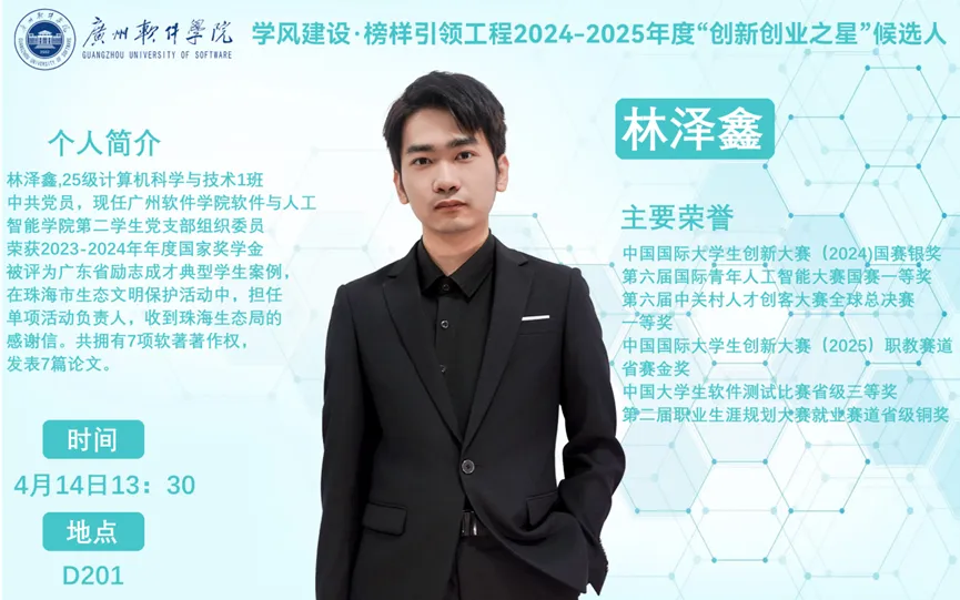 创新创业展风采,榜样引领向未来,引导广大学子以榜样为标杆、向榜样学习,由广州软件学院学生处主办,网络空间安全学院承办的2024-2025年度“创新创业之星”现场答辩会即将启幕,一众科创学子将齐聚现场,展现他们的青春科创锋芒与逐梦征程!