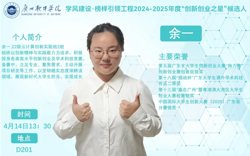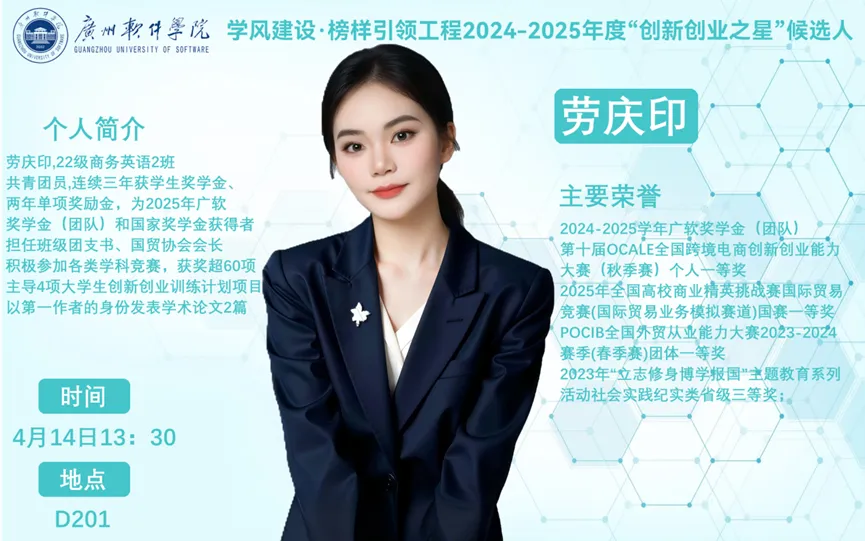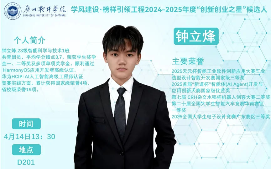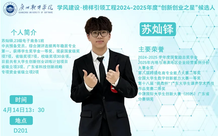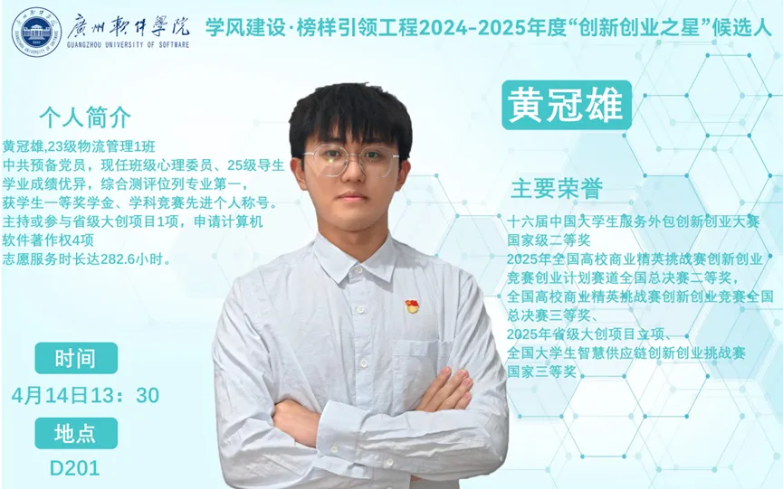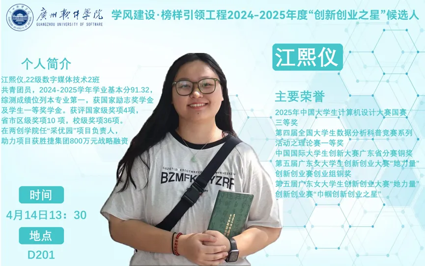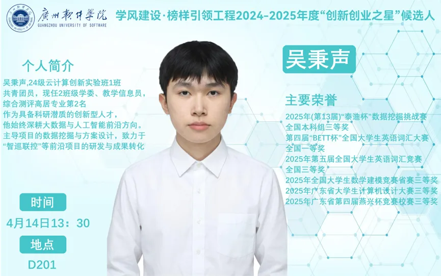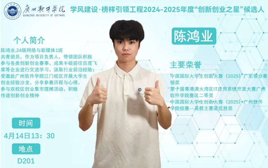 创新创业展风采,榜样引领向未来,引导广大学子以榜样为标杆、向榜样学习,由广州软件学院学生处主办,网络空间安全学院承办的2024-2025年度“创新创业之星”现场答辩会即将启幕,一众科创学子将齐聚现场,展现他们的青春科创锋芒与逐梦征程!
