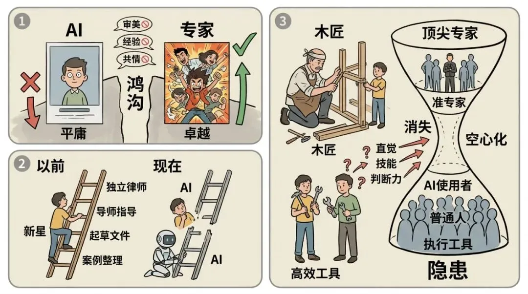 人才成长的对比以前,法学院毕业生从整理案例、起草文书做起,跟着前辈一步步打磨,最终成为独当一面的律师。现在,AI包揽了所有“学徒活”,律所不再需要初级助理。通往专家的梯子,最下面几级被抽掉了。这和传统木匠、裱画手艺的困境如出一辙——因为高效工具,年轻人不愿再花漫长时间学徒,古老手艺慢慢失传。