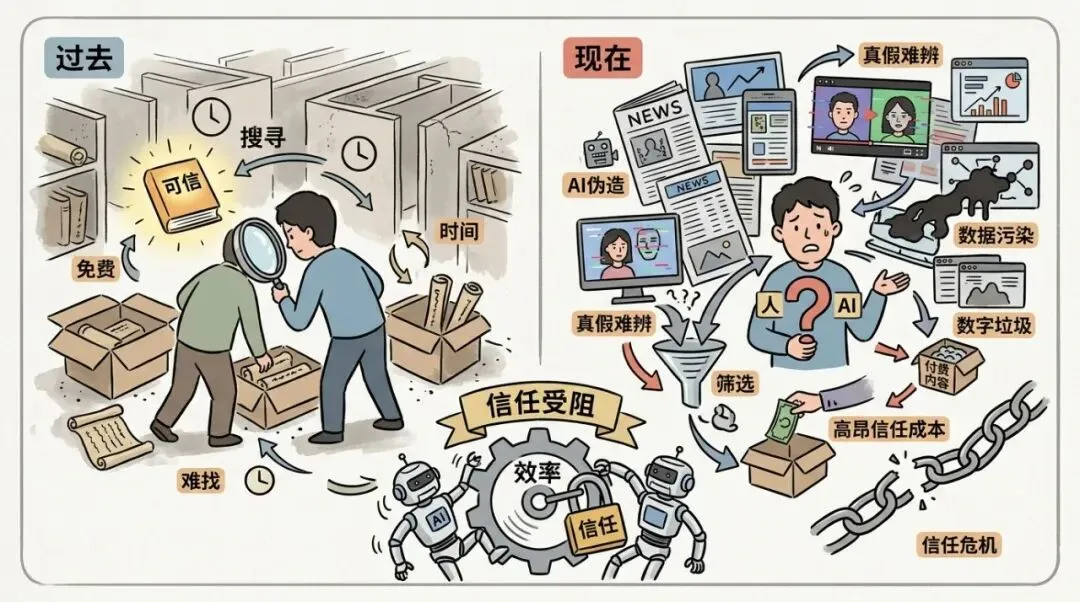 信息环境的对比以前是“信息免费但难找”,我们花时间找可信信息;现在是“信息泛滥但难辨真假”,我们要花更多时间筛选,甚至要为可信信息付费。AI生成的假消息全网疯传,数据“投毒”污染模型,优质信息被“数字泔水”淹没。你看到一条新闻,第一反应不是“信不信”,而是“这是人写的还是AI写的”。