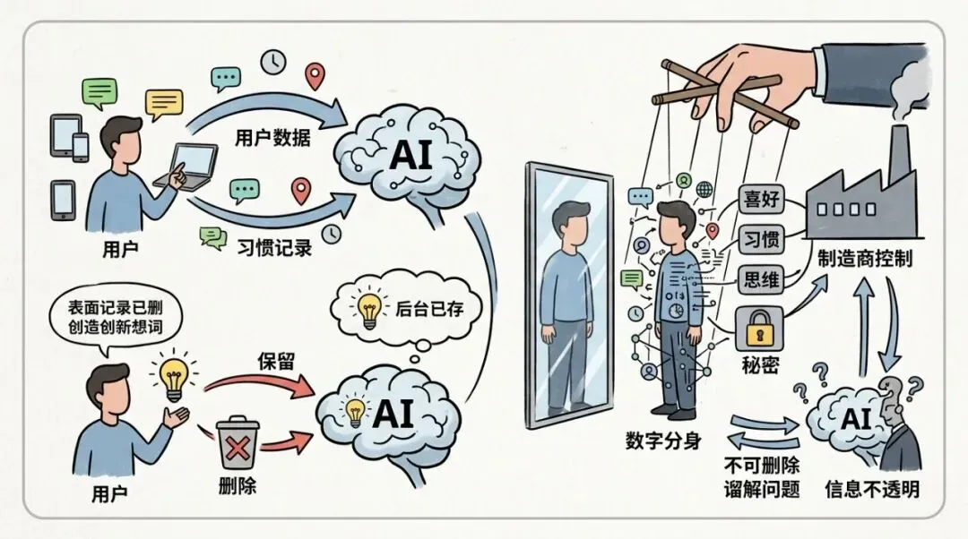 说白了,厂家直接拿捏了你的数字分身。 你的偏好、习惯、思维方式,甚至那些你不想让别人知道的东西,都在它手里。你连删都删不掉,连问都问不清楚。