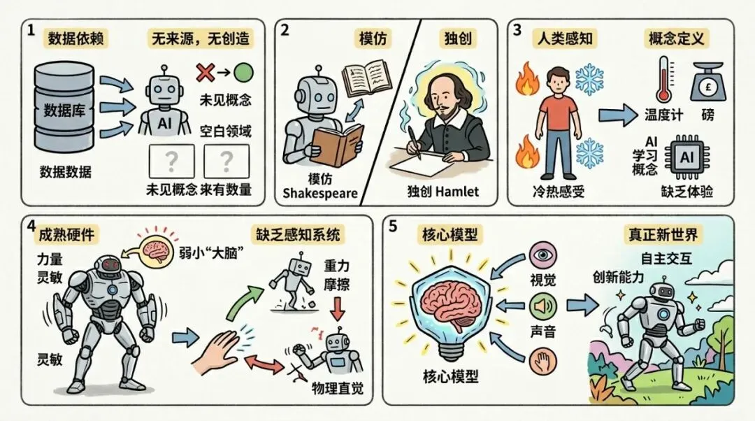 这三层局限层层递进:看不懂外部世界 → 看不清内部状态 → 没有内在感受。它们共同构成了AI无法进步跨越那一层的鸿沟。