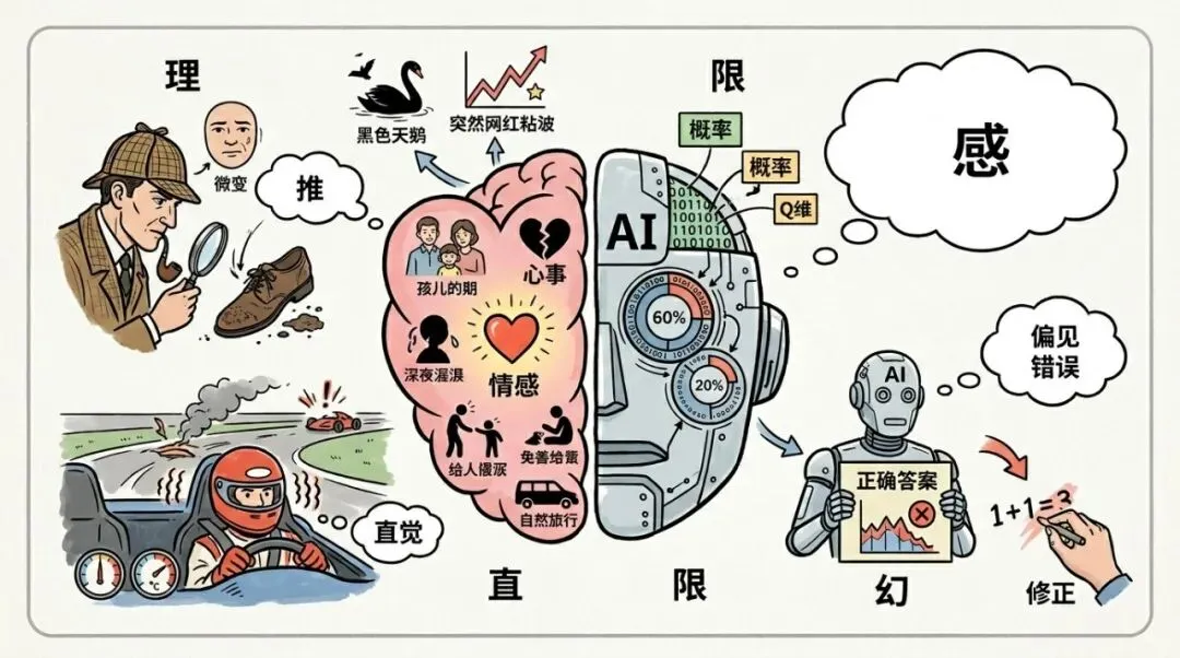 人类能反思:“我刚才的推理对吗?”AI没有这种能力。这就是AI幻觉的根源——它自信满满地给出错误答案,却没有“我不确定”的信号。人类可以主动检查、修正;AI只能依赖数据,无法“跳出自己看自己”。