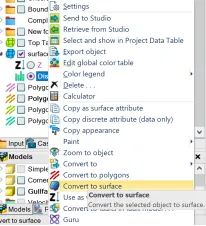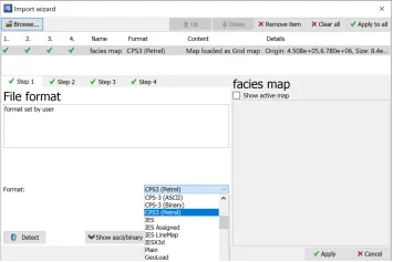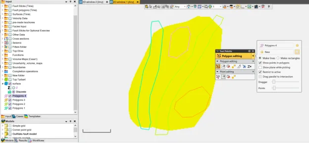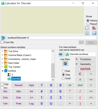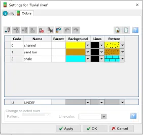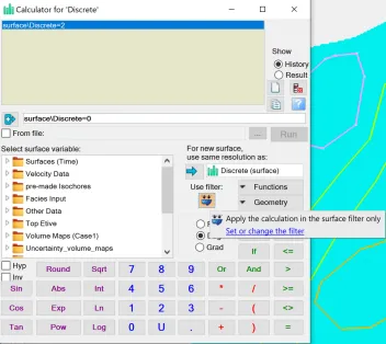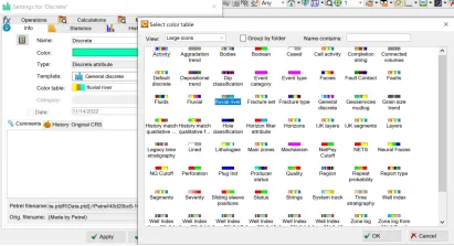 在实际工作中,我们往往需要自定义一个离散属性的面,比如岩性或者是沉积相等离散属性。下面介绍一种利用global surface filter功能的方法简单快速的生成离散属性的surface。1、按照研究区的实际情况,设置离散属性色标。以相图为例,在Template面板中的Color tables右键选择Insert new discrete color table,设置新色标的名称及每个相的颜色和代码,点击OK保存。2、右键Input面板中的任意一个surface,或者使用make surface新建一个surface后右选择Insert new attribute,然后选择Discrete。之后在info界面下将color table换成上一步新建的色标,点击OK保存。3、打开一个2D窗口显示上步新添加的离散属性面,然后使用Polygon editing工具,画出各离散相的不同区域,例如polygon1内为河道相,polygon2内为河道相,polygon3和4内为沙坝相,其余地方为河漫滩相。4、右键离散属性面,打开Calculator。让离散属性面等于大面积的相的代码后点击ENTER。例如此处等于2。根据第一步的设置,代码为2表示河漫滩相。5、继续右键离散属性面,打开Calculator。分别让第3步生成的Polygon中赋予相应的离散相。例如Polygon1内为河道相,代码为0。则在公式处让离散属性面等于0。此处注意将鼠标放至Use filter的图标上点亮,并选择set or change the filter去设置Misc settings 2下的Global surface filter(或者去project setting标签下的Misc settings 2里进行设置),将polygon1放进相应位置中,选择Apply inside(因为是给polygon内部赋值),然后点击OK保存,再点击计算器的ENTER。6、重复步骤5,将其余polygon进行相的赋值,结果如下图所示。7、右键该完成后的离散属性面,选择convert to surface,将其变为一个独立的离散相的surface供后续工作使用。8、 相图的导出。右键上一步生成的独立的离散属性的surface,选择export object,如果想要导出给PetroMod使用,则选择CPS-3 grid格式。9、打开PetroMod工区。选择File->Import files,选择文件,则会打开数据加载向导,在Step1选择CPS3(Petrel)格式,点击继续即可。加载进PetroMod后如图所示。可以继续在PetroMod中完成后续的工作。— END —