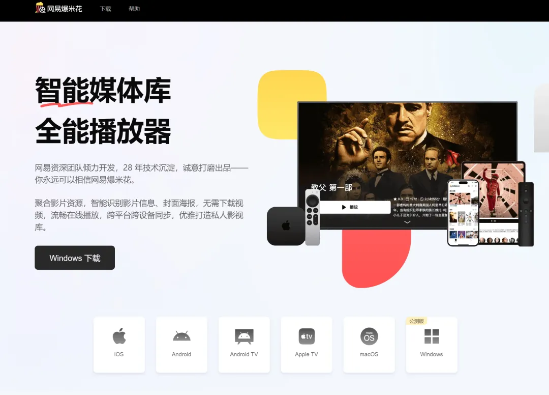 网易爆米花是类似一款Jellyfin 的智能播放它可以自动消削刮影片的海报、评分、简介、内容等等,还可以自动识别电视剧支持导入百度网盘、阿里网盘中的视频,也支持WebDAV它还支持HDR、杜比、蓝光等等视频内容,可以观看高清内容,而且还支持各种格式关键,特别是它不用下载就可以直接在线观看,特别的方便,只需网络就可以目前支持iOS,安卓,电视盒子,MacOS, Windows 目前暂不暂不支持